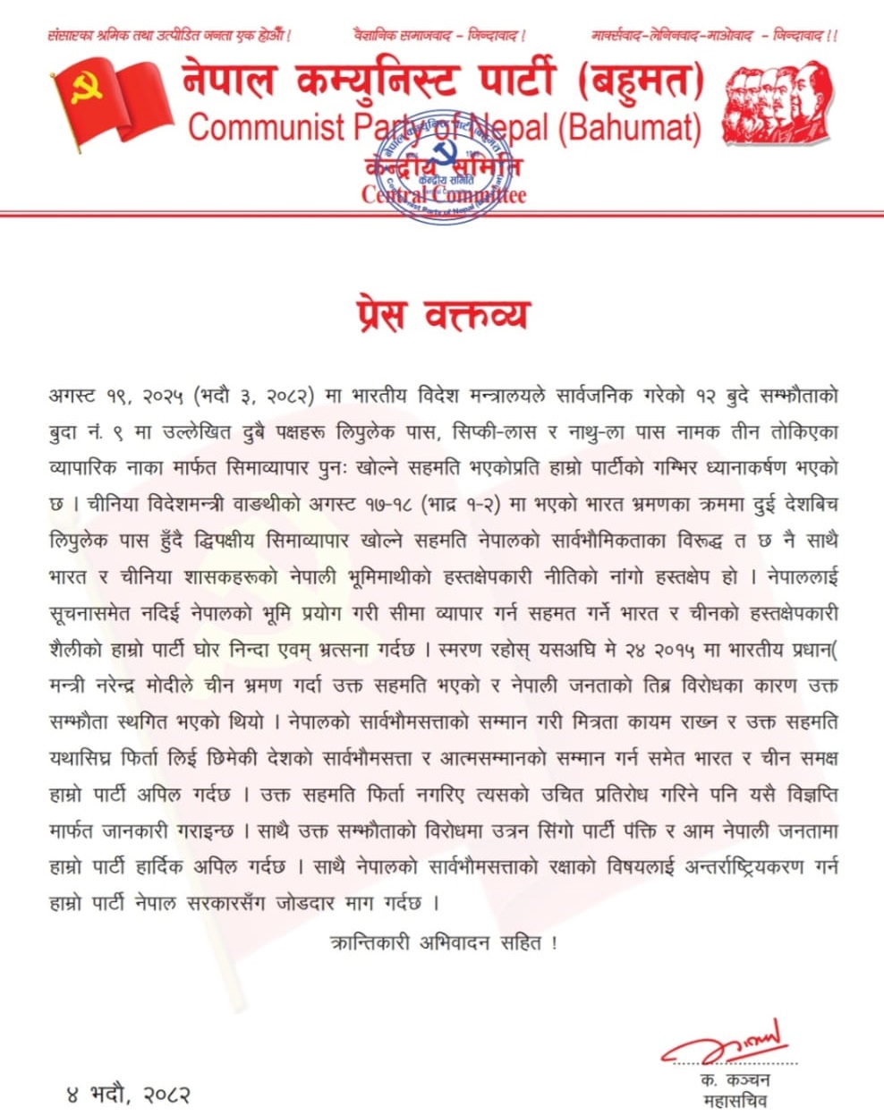 नेकपा (बहुमत) चीन र भारतले नेपालको भूमि लिपुलेक पास अवैधरुपमा प्रयोग गरि व्यापार गर्ने सहमतिको विरोध जनाउने नेपालको पहिलो दल बनेको छ । नेपालको संसदमा भएका दलहरुले यसबारेमा यो समाचार तयार पार्दासम्म आफ्‌नो धारणा सार्वजनिक गरेका छैनन् ।