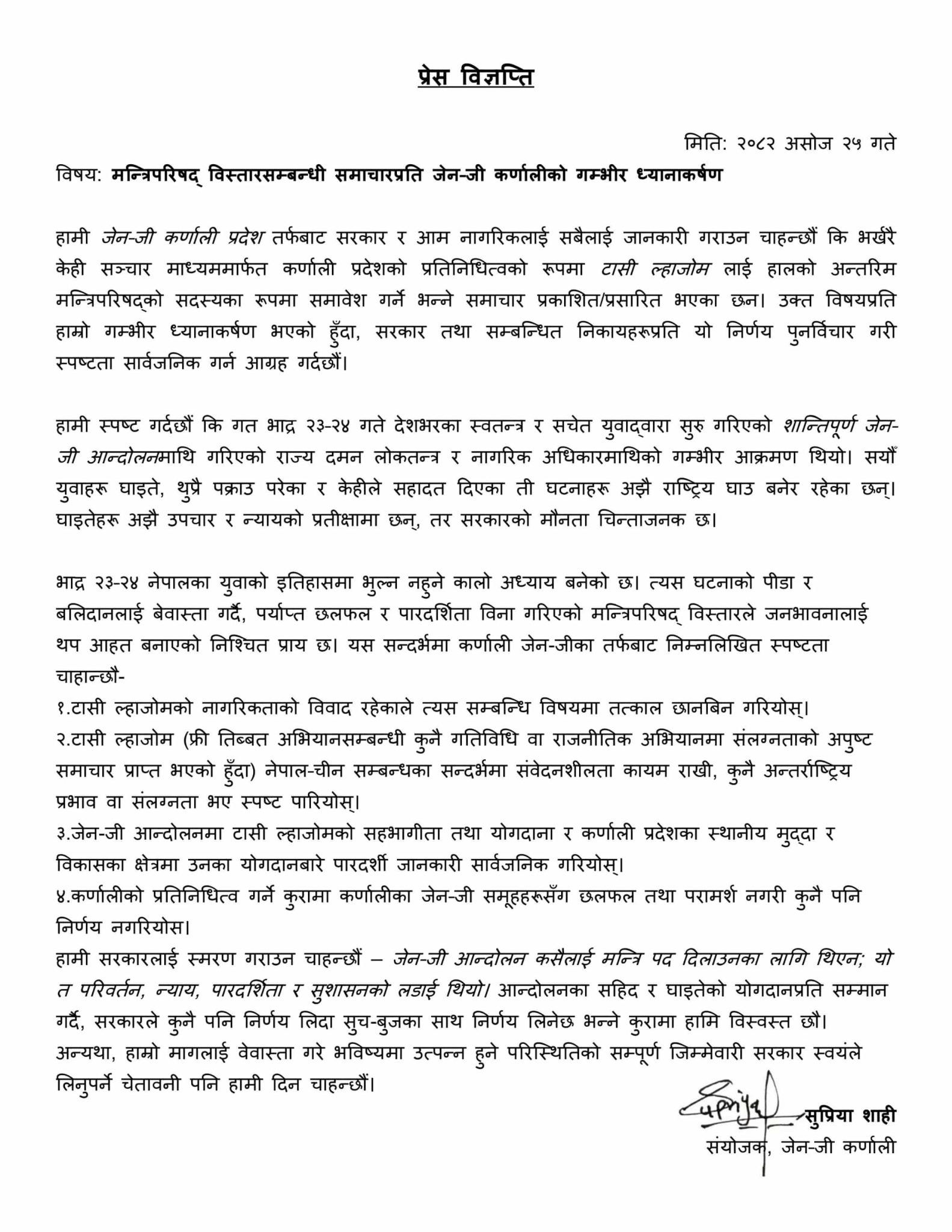 जेनजी आन्दोलनका तर्फबाट कर्णाली संयोजक सुप्रिया शाहीले जारी गरेको विज्ञप्तिमा टासीको नागरिकता विवादित रहेको र उनी जेनजी आन्दोलनमा कुनै भूमिका नभएको उल्लेख गरिएको छ । साथै, टासी ‘फ्री तिब्बत’ अभियानसँग जोडिएकी हुनसक्ने आशंका व्यक्त गर्दै त्यसबारे छानबिन गर्न पनि माग गरिएको छ । विज्ञप्तिमा भनिएको छ, “कर्णालीको प्रतिनिधित्वको नाममा जेनजीहरुसँग कुनै छलफल र परामर्श नगरी निर्णय गर्न खोजिएको छ, जुन अस्वीकार्य छ ।” कर्णालीका जेनजीहरूले सम्भावित प्रतिनिधिहरूको सूचीमा टासीको नाम कहिल्यै प्रस्ताव नभएको बताएका छन् ।