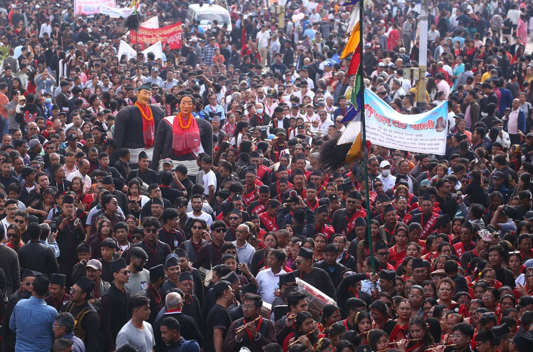 काठमाडौं, कात्तिक ५ । नेपाल संवत् ११४६ को नयाँ वर्ष बुधबारदेखि देशभर विभिन्न कार्यक्रमसहित मनाइँदैछ । राजधानी काठमाडौंको वसन्तपुर क्षेत्र नेवार समुदायको सांस्कृतिक रौनकले आज बिहानैदेखि रंगिएको छ । नेपाल संवतलाई नयाँ वर्षका रूपमा मनाउने नेवार समुदायले वसन्तपुर दरबार क्षेत्रबाट परम्परागत भेषभूषा, बाजागाजा, नाचगान र झाँकी प्रदर्शनसहित भव्य सांस्कृतिक र्यालीको आयोजना गरेको हो । र्यालीमा सहभागीहरूले शंखधर साख्वाको योगदानलाई स्मरण गर्दै नेपाल संवतको ऐतिहासिक र सांस्कृतिक महत्व उजागर गरेका छन् ।
