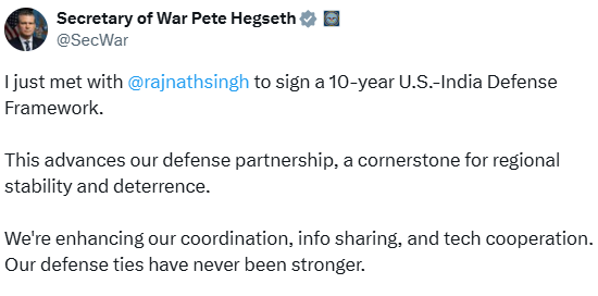 भारतीय रक्षा मन्त्री राजनाथ सिंहले सम्झौतापछि प्रतिक्रिया दिँदै भने, “हामीले ‘फ्रेमवर्क फर द युएस–इन्डिया मेजर डिफेन्स पार्टनरसिप’ मा हस्ताक्षर गरेर हाम्रो बलियो साझेदारीमा नयाँ दशकको सुरुआत गरेका छौँ । यो ऐतिहासिक उपलब्धि हो ।” उनका अनुसार, सम्झौताले भारत–अमेरिका रक्षा सम्बन्धलाई स्पष्ट नीतिगत दिशा प्रदान गर्नेछ र इन्डो–प्यासिफिक क्षेत्रमा स्वतन्त्र, खुला र नियममा आधारित अन्तर्राष्ट्रिय व्यवस्था सुनिश्चित गर्न योगदान दिनेछ । यो हस्ताक्षर आसियान–भारत रक्षा मन्त्रीहरूको अनौपचारिक बैठकको अवसरमा सम्पन्न भएको हो । बैठक आगामी नोभेम्बर १ मा हुने एडिएमएम–प्लस सम्मेलन अघि आयोजना गरिएको थियो । सिंहले भ्रमण अघि नै आसियान सदस्य राष्ट्रहरूसँगको सुरक्षा सहकार्य बलियो बनाउने र भारतको “एक्ट इस्ट नीति”लाई अगाडि बढाउने उद्देश्य रहेको बताएका थिए । विशेषज्ञहरूले यो सम्झौतालाई भारत–अमेरिका रणनीतिक सम्बन्धको नयाँ माइलस्टोनका रूपमा हेरेका छन् । यसले रक्षा–प्रविधि आदान–प्रदान, संयुक्त उत्पादन, तथा इन्डो–प्यासिफिक क्षेत्रमा शक्ति सन्तुलनमा महत्वपूर्ण प्रभाव पार्ने अनुमान गरिएको छ । अमेरिकाका लागि यो सम्झौता चीनको प्रभाव घटाउने रणनीतिक कदम हो भने भारतका लागि स्वदेशी रक्षा उद्योगलाई सुदृढ बनाउने अवसरको रूपमा देखिएको छ ।
