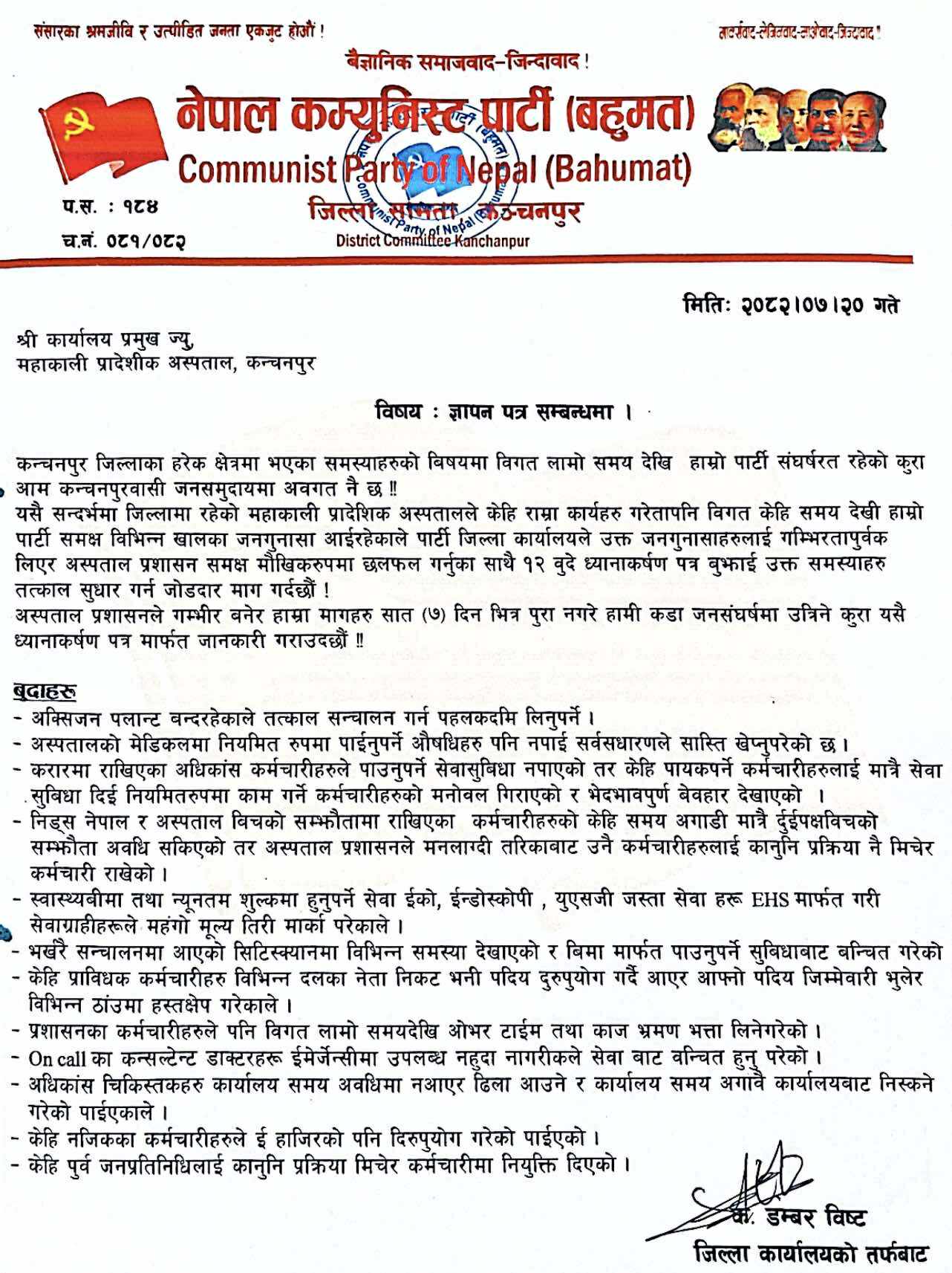 महाकाली अस्पतालमा अनियमितता र सेवा अभावबारे नेपाल कम्युनिष्ट पार्टी (बहुमत) को ज्ञापनपत्र