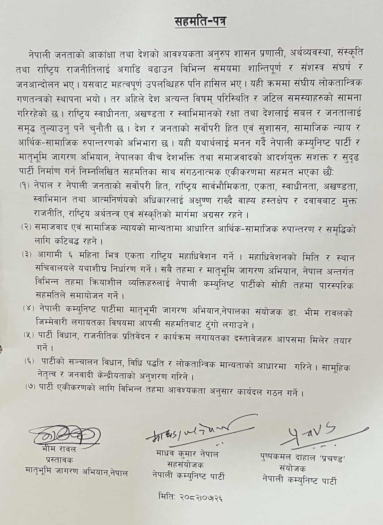 नेपालको स्वतन्त्रता, राष्ट्रिय एकता र सार्वभौमिकताको रक्षा गर्ने, समाजवाद र सामाजिक न्यायमा आधारित आर्थिक रुपान्तरणका लागि एकसाथ अभियान सञ्चालन गर्ने, आगामी एकता राष्ट्रिय महाधिवेशन आयोजना गर्ने, मातृभूमि जागरण अभियानका संयोजक भीम रावललाई नेपाल कम्युनिष्ट पार्टीमा संयोजनको जिम्मेवारी दिने, राजनीतिक कार्यक्रम, नीति तथा गतिविधिमा सहकार्य र तालमेल गर्ने, पार्टीभित्र लोकतान्त्रिक मूल्य र सामूहिक नेतृत्वको अभ्यास गर्ने, एकीकरणका लागि आवश्यक संगठनात्मक संरचना बनाउने व्यवस्था गरिएको छ । सहमति–पत्रमा भनिएको छ,। यो सहमति नेपाली कम्युनिष्ट आन्दोलनभित्र लामो समयदेखि देखिएको विभाजन अन्त्य गर्दै एकीकृत दिशा तय गर्नेतर्फको महत्वपूर्ण कदमका रूपमा हेरिएको छ ।
