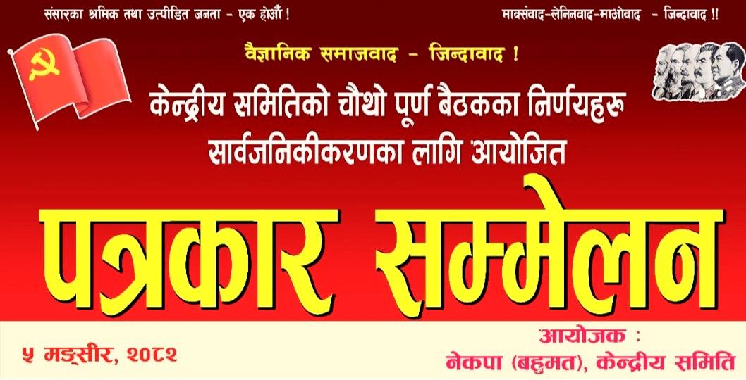 काठमाडौँ । नेकपा (बहुमत) केन्द्रीय समितिले चौथो पूर्ण बैठकका निर्णयहरू सार्वजनिक गर्न भोली राजधानीमा पत्रकार सम्मेलन आयोजना गर्ने भएको छ । राजधानीको अनामनगर स्थित संवाद डबलीमा दिनको ठिक १२ः ३० बजे हुने उक्त पत्रकार सम्मेलनमा प्रमुख वक्ता पार्टीका महासचिव धर्मेन्द्र बास्तोला ‘कञ्चन’ रहने उक्त पार्टीको केन्द्रीय कार्यालयले बताएको छ ।