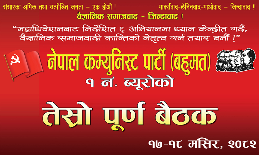 काठमाडौं । नेपाल कम्युनिस्ट पार्टी (बहुमत) १ नम्बर ब्यूरोको तेस्रो पूर्ण बैठक हालै सम्पन्न भएको छ । ब्यूरो इन्चार्ज ‘धमिल’ को अध्यक्षता र केन्द्रीय सचिवालय सदस्य ‘गम्भीर’ को प्रमुख आतिथ्यतामा सम्पन्न बैठकले मुलुकमा देखिएका राजनीतिक, आर्थिक र सामाजिक चुनौतीहरूको समीक्षा गर्दै नयाँ राजनीतिक हस्तक्षेप आवश्यक रहेको निष्कर्ष निकालिएको छ । बैठकका प्रमुख अतिथि गम्भीरले प्रशिक्षणमूलक राजनीतिक मन्तव्य प्रस्तुत गर्दै जेन–जी आन्दोलनको ऐतिहासिक पृष्ठभूमिबारे चर्चा गरे । उनले मुलुकको स्वाधीनता र सार्वभौमसत्तामाथि चुनौतिहरू बढ्दै गएको दाबी गर्दै क्रान्तिकारी शक्तिहरू निर्णायक रूपमा अगाडि बढ्नुपर्ने आवश्यकता औंल्याए । गम्भीरले स्वाधीन संयुक्त सरकार गठन, जनसंविधान निर्माण र देशव्यापी जनसंघर्ष–जनसंवाद अभियानलाई पार्टीको मुख्य राजनीतिक दायित्वका रूपमा अघि सार्ने बताए ।