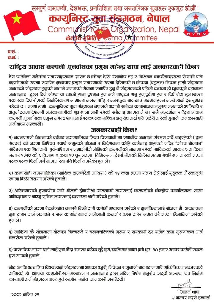 लुम्बिनी, मंसिर २१ — राष्ट्रिय आवास कम्पनीमा भूमि खरिद–विक्री तथा सरकारी जग्गा हिनामिना गरेको आरोपसहित कम्युनिस्ट युवा संगठन नेपालले कम्पनीका प्रमुख महेन्द्र थापालाई निजकै कार्यकक्षमै कालोमोसो लगाएको छ । संगठनको ५ नं. ब्युरो इन्चार्जद्धारा जारी गरिएको विज्ञप्तिमा कम्पनीभित्र गम्भीर भ्रष्टाचार र अवैध कारोबार भइरहेकोले जनकार्वाही गरिएको बताइएको छ । विज्ञप्तिअनुसार कम्पनीमा विगतदेखिनै देखिँदै आएको अनियमितताप्रति सरकार, सञ्चालक समिति र सम्बन्धित निकाय मौन बसेको भन्दै संगठनले चेतावनी स्वरुप मोसो दलेको जनाएको छ । युवाहरूले सार्वजनिक सम्पत्ति लुटिन नदिने उद्धघोष गर्दै कार्वाहीको प्रक्रिया अघि बढाउन समेत माग गरेका छन् । संगठनले जारी गरेको विज्ञप्तिको जनकारबाही किन ? भन्ने शिर्षकमा कारबाही गर्नुका कारणहरु खुलाइएको छ ।