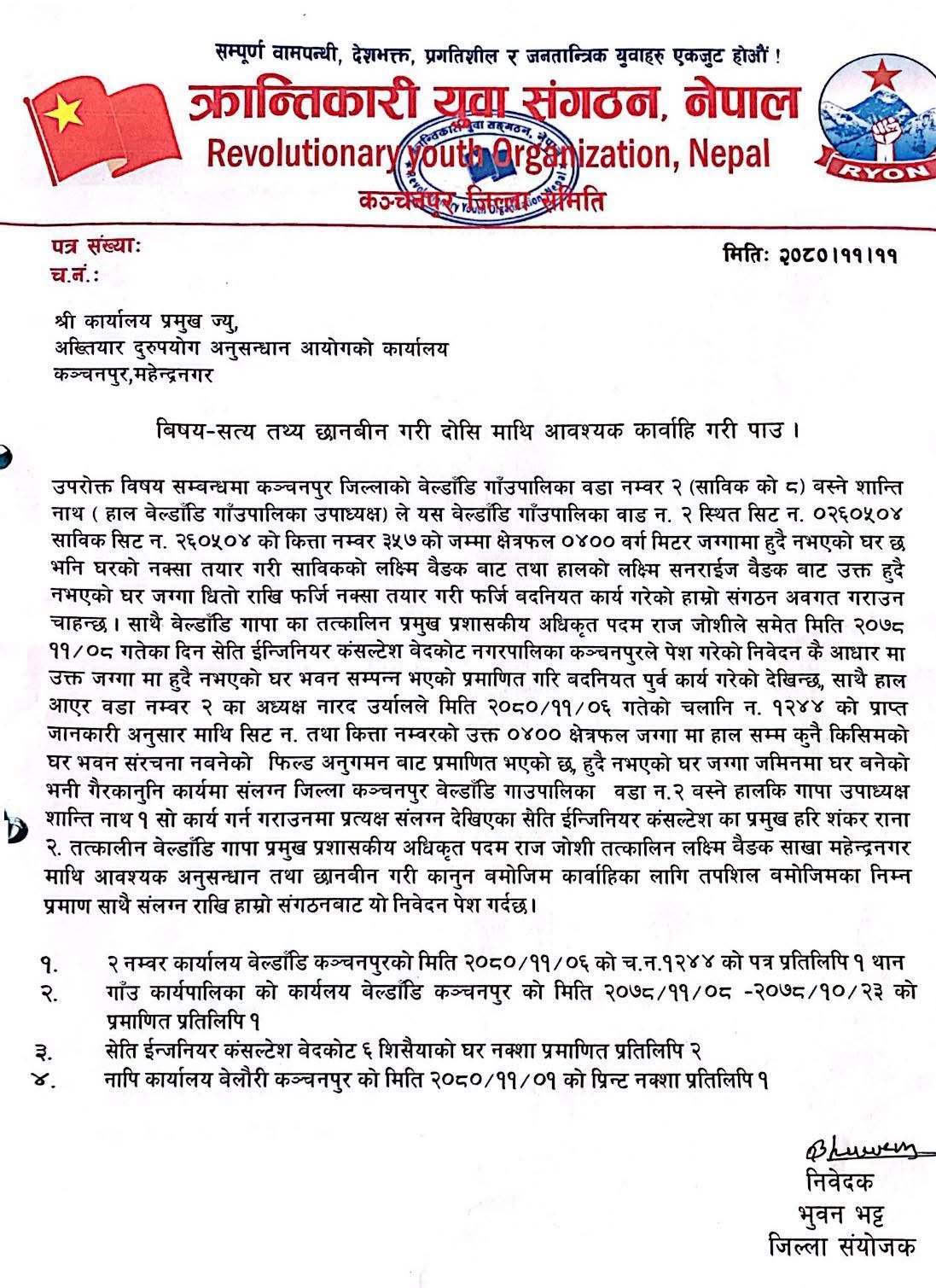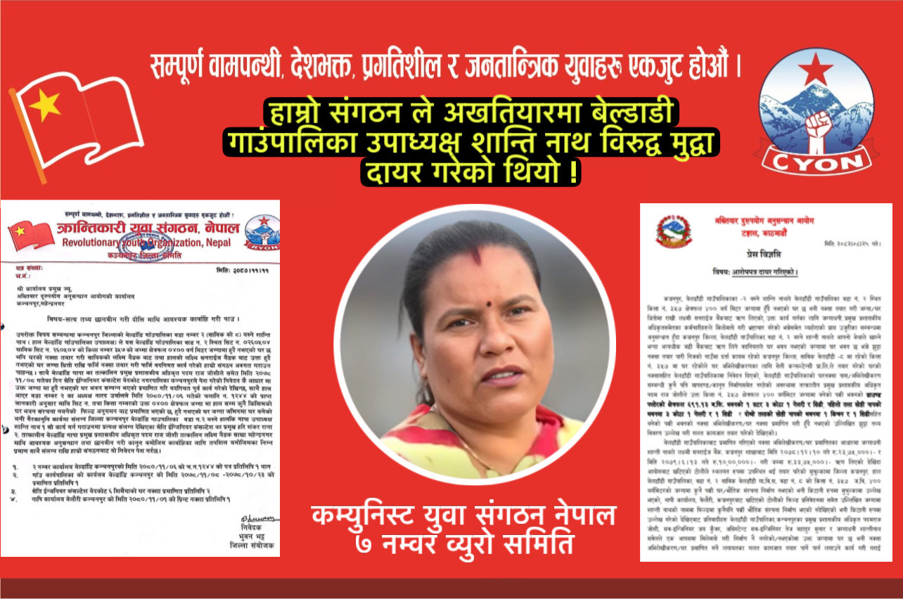 नेकपा (बहुमत) को साहयक संगठन तत्कालिन क्रान्तिकारी युवा संगठन नेपाल हाल कम्युनिस्ट युवा संगठन नेपाल कन्चनपुरले अखतियारमा बेल्डाडी गाउंपालिका उपाध्यक्ष शान्ति नाथ विरुद्व मुद्वा दायर गरेको थियो । त्यसको जगमा सान्ति नाथ लगायत ४ जना विरुद्व आरोप पत्र दायर भएको छ भने उपाध्यक्ष शान्ति नाथ निलम्वन परेकी छन् । यो सबै हाम्रो संगठनको पहलकदमीमा भएको कम्युनिस्ट युवा संगठन नेपाल का केन्द्रीय सभिव दिपेन्द्र सिंह ऐरीले बताएका छन् । यसै गरी हामी संघर्षका विभिन्न रुपहरु प्रयोग गरेर जनताको सेवा गरिरहने पनि उनले बताए ।