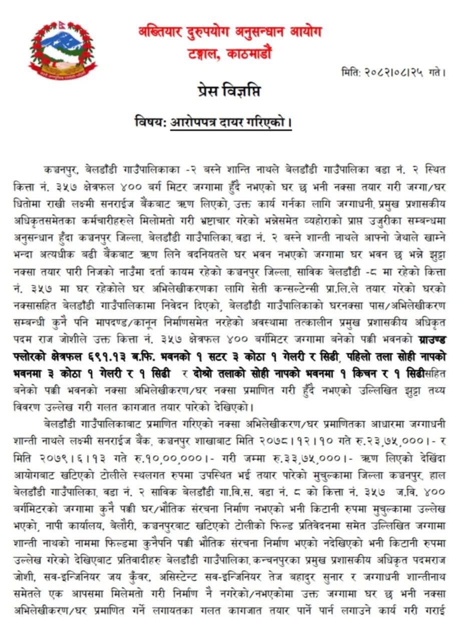 काठमाडौं । अख्तियार दुरुपयोग अनुसन्धान आयोगले कञ्चनपुरको बेलडाँडी गाउँपालिका–२ मा घर नबनाई बनेको भनी नक्सा तयार गरी बैंकबाट ऋण लिएको प्रकरणमा संलग्न रहेको भन्दै जग्गाधनी शान्ति नाथसहित स्थानीय तहका कर्मचारीविरुद्ध आरोपपत्र दायर गरेको छ । आयोगका अनुसार सम्बन्धित जग्गामा कुनै पनि भौतिक संरचना निर्माण नभएको अवस्थामा समेत घर बनेको भनी गलत नक्सा तथा कागजात तयार पारिएको थियो । ती कागजातका आधारमा लक्ष्मी सनराइज बैंक, कञ्चनपुर शाखाबाट ठूलो रकमको ऋण लिइएको पाइएको छ । अनुसन्धानका क्रममा तत्कालीन प्रमुख प्रशासकीय अधिकृत, सब–इन्जिनियर तथा सहायक सब–इन्जिनियरले आपसी मिलेमतोमा नियमविपरीत नक्सा प्रमाणीकरण गरी भ्रष्टाचारजन्य कार्य गरेको ठहर गर्दै आयोगले उनीहरूविरुद्ध विशेष अदालतमा मुद्दा दायर गरेको जनाएको छ ।