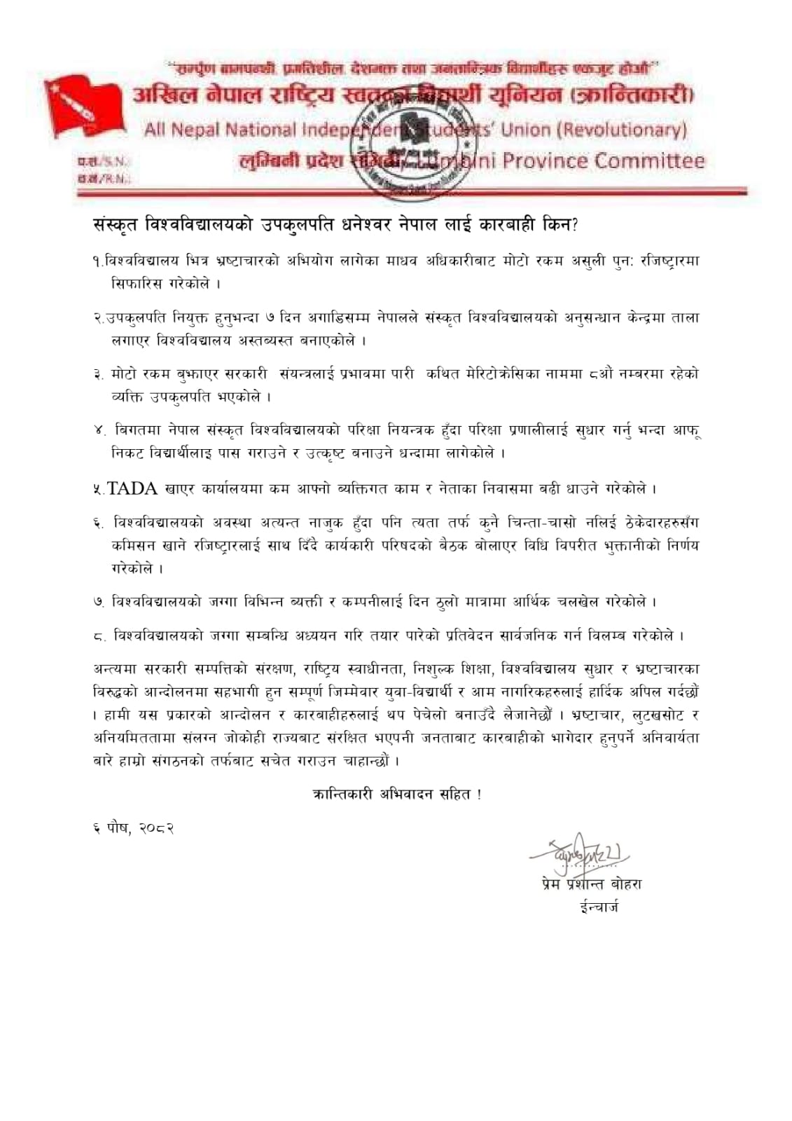 अनेरास्ववियू (क्रान्तिकारी)का अनुसार विश्वविद्यालयमा पर्याप्त स्रोतसाधन हुँदाहुँदै पनि शैक्षिक तथा भौतिक पूर्वाधार सुधार नगरी कागजी बिल–भरपाइका आधारमा भुक्तानी गर्ने, ठेकेदार र प्रशासनबीच मिलेमतो गरी कमिसन असुल्ने जस्ता कार्य हुँदै आएका छन् । यसले विश्वविद्यालयको गरिमा र विद्यार्थीहरूको भविष्यमा गम्भीर असर परेको संगठनको भनाइ छ । संगठनले उपकुलपति धनेश्वर नेपाललाई भ्रष्ट कमिसनखोरहरूको संरक्षकको रूपमा चित्रण गर्दै भ्रष्टाचार अभियोग लागेका व्यक्तिलाई पुनः रजिष्ट्रारमा सिफारिस गर्नु, परीक्षा प्रणालीमा अनियमितता गर्नु, टिएडिए दुरुपयोग गर्नु तथा विश्वविद्यालयको जग्गामा आर्थिक चलखेल गर्नुजस्ता कारणले जनकारबाही गर्न बाध्य भएको जनाएको छ ।