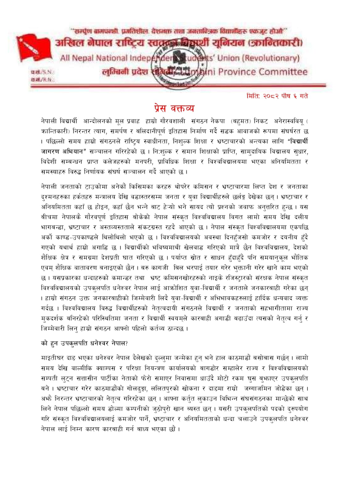 दाङ । नेकपा (बहुमत) निकट विद्यार्थी संगठन अनेरास्ववियू (क्रान्तिकारी) लुम्बिनी प्रदेशले नेपाल संस्कृत विश्वविद्यालयका उपकुलपति धनेश्वर नेपालमाथि भ्रष्टाचार र अनियमिततामा संलग्न रहेको आरोप लगाउँदै जनकारबाही गरेको जनाएको छ । संगठनले शैक्षिक क्षेत्रमा मौलाउँदै गएको भ्रष्टाचारविरुद्ध संघर्षलाई अझ तीव्र बनाउने घोषणा समेत गरेको छ । प्रदेश इन्चार्ज प्रेम प्रशान्त बोहराद्वारा हस्ताक्षरित विज्ञप्तिमा मन्त्रालयदेखि वडास्तरसम्म करको भार बढाएर कमिसन र भ्रष्टाचारमा लिप्त शक्तिहरू सक्रिय रहेको उल्लेख गरिएको छ । विज्ञप्तिमा नेपाल संस्कृत विश्वविद्यालय पनि लामो समयदेखि दलीय भागबन्डा, आर्थिक चलखेल र अव्यवस्थाको सिकार बन्दै आएको आरोप लगाइएको छ ।