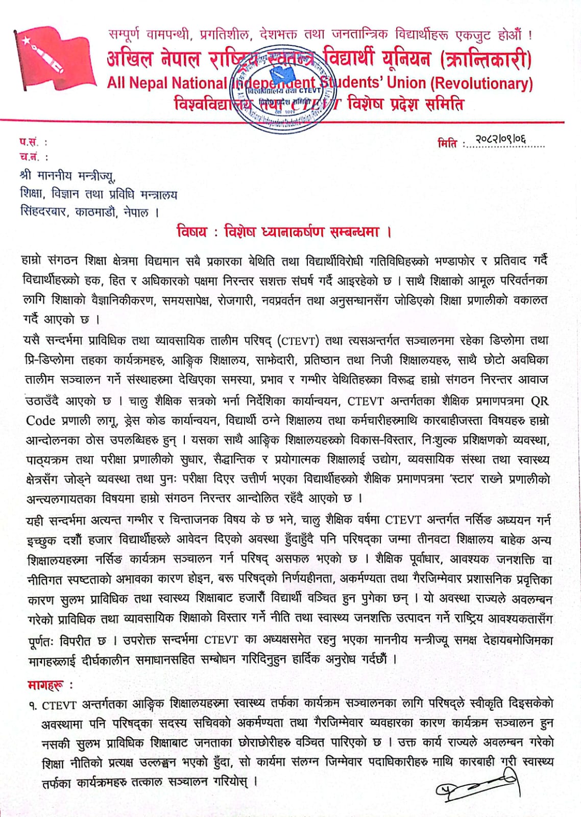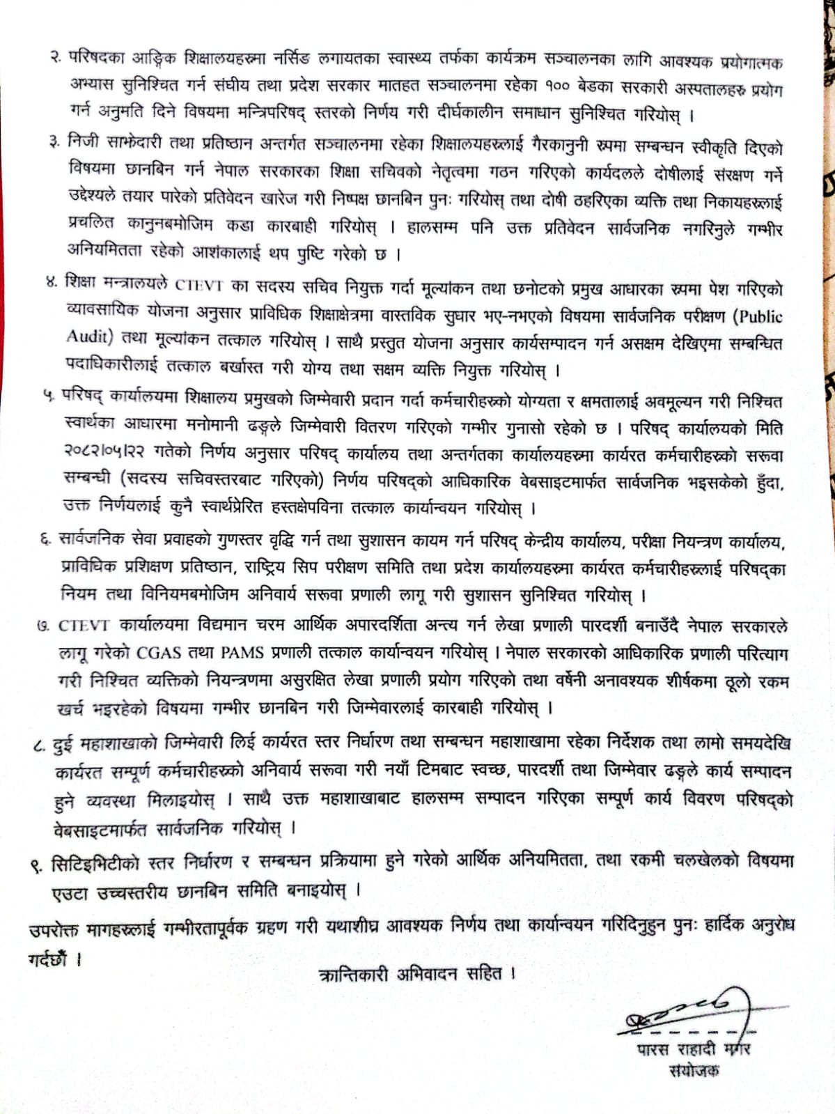 यसैगरी निजी साझेदारी तथा प्रतिष्ठानअन्तर्गत सञ्चालनमा रहेका शिक्षालयलाई गैरकानुनी रूपमा सम्बन्धन दिएको विषयमा गठित कार्यदलको प्रतिवेदन खारेज गरी निष्पक्ष छानबिन गर्न र दोषीमाथि कडा कारबाही गर्न संगठनले माग गरेको छ । CTEVT का पदाधिकारी नियुक्ति गर्दा पेश गरिएका व्यावसायिक योजनाअनुसार कार्यसम्पादन भए–नभएको सार्वजनिक परीक्षण गर्नुपर्ने र असफल देखिए सम्बन्धित पदाधिकारीलाई बर्खास्त गरी योग्य तथा सक्षम व्यक्ति नियुक्त गर्नुपर्ने माग पनि ध्यानाकर्षणपत्रमा समेटिएको छ । परिषद् कार्यालय तथा मातहतका निकायमा कार्यरत कर्मचारीहरूको नियमअनुसार सरुवा गर्न, मनोमानी जिम्मेवारी वितरण अन्त्य गर्न र सुशासन कायम गर्न संगठनले जोड दिएको छ । साथै परिषद्भित्र देखिएको आर्थिक अपारदर्शिता अन्त्य गर्न CGAS तथा PAMS प्रणाली तत्काल कार्यान्वयन गर्न, स्तर निर्धारण तथा सम्बन्धन प्रक्रियामा हुने आर्थिक चलखेलबारे उच्चस्तरीय छानबिन समिति गठन गर्न माग गरिएको छ ।