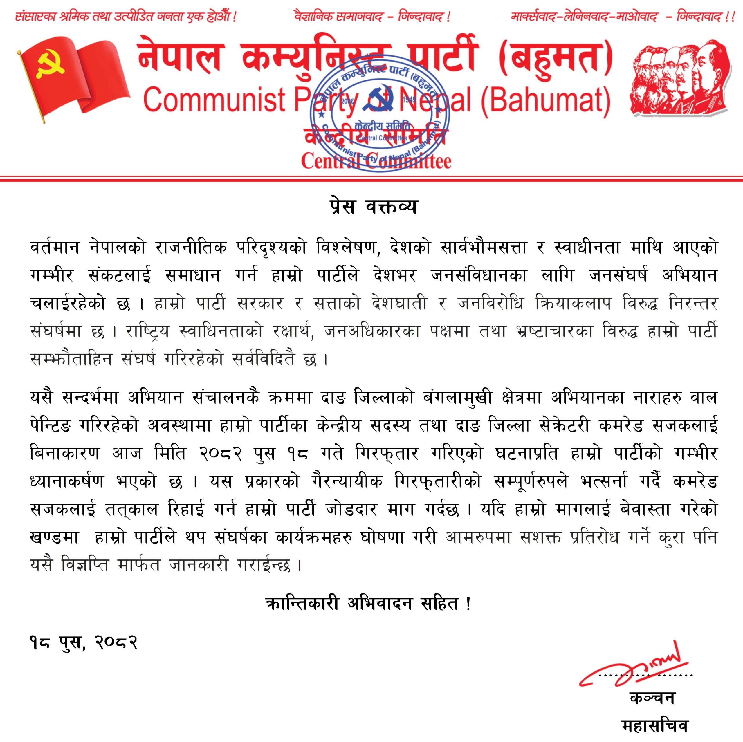 दाङ । नेपाल कम्युनिस्ट पार्टी (बहुमत) ले आफ्ना केन्द्रीय सदस्य तथा दाङ जिल्ला सचिव कमरेड सजकलाई विनाकारण पक्राउ गरिएको भन्दै कडा आपत्ति जनाएको छ । पार्टी केन्द्रीय समितिद्वारा जारी प्रेस वक्तव्य अनुसार जनसंविधानका लागि देशव्यापी जनसंघर्ष अभियान सञ्चालन भइरहेका बेला दाङ जिल्लाको बाँगलाचुली क्षेत्रमा अभियानका नारा लेख्ने क्रममा सजनलाई पुष १५ गते राज्य पक्षले पक्राउ गरेको बताईएको छ । वक्तव्यमा वर्तमान नेपालको राजनीतिक परिस्थितिको विश्लेषण गर्दै पार्टीले देशको सार्वभौमिकता, स्वाधीनता, जनअधिकार तथा भ्रष्टाचारविरुद्ध निरन्तर संघर्षरत रहेको जनाएको छ । सरकार र सत्तापक्षबाट भइरहेको देशघाती तथा जनविरोधी क्रियाकलापविरुद्ध जनसंघर्ष अभियान सञ्चालन गरिरहेको अवस्थामा गरिएको यो गिरफ्तारीलाई गैरकानुनी र दमनकारी कदम भएको पार्टीको ठहर छ । पार्टीले गिरप्mतार नेता सजकलाई तत्काल बिनाशर्त रिहा गर्न सरकारसँग जोडदार माग गरेको छ । साथै मागको बेवास्ता भएमा थप संघर्षका कार्यक्रम घोषणा गरी सशक्त प्रतिरोधमा उत्रिने चेतावनी पनि पार्टीले दिएको छ ।