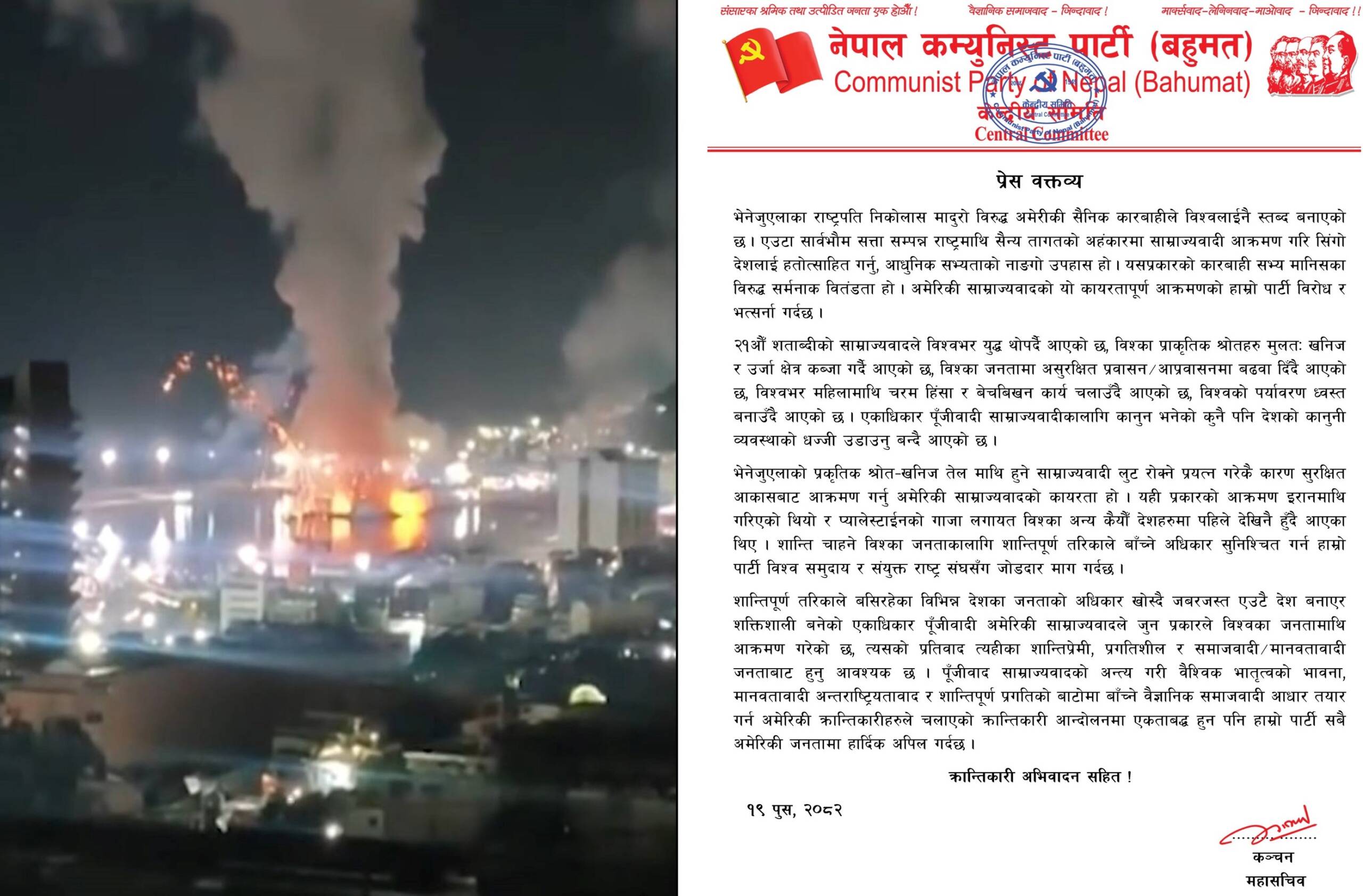काठमाडौं । नेपाल कम्युनिस्ट पार्टी (बहुमत) ले भेनेजुएलाका राष्ट्रपति निकोलस मादुरो विरुद्ध अमेरिकी साम्राज्यवादी शक्तिद्वारा गरिएको सैन्य कारबाहीको कडा विरोध गरेको छ । पार्टीले उक्त आक्रमणले विश्वलाई थप अस्थिर बनाउने तथा सार्वभौम राष्ट्रमाथि गरिएको नाङ्गो हस्तक्षेप भएको जनाएको छ । केन्द्रीय समितिद्वारा जारी प्रेस वक्तव्यमा भनिएको छ कि एक सार्वभौमसत्ता सम्पन्न राष्ट्रमाथि सैनिक तागतको दम्भमा गरिने आक्रमण आधुनिक सभ्यताको उपहास हो । यस्तो कार्यले सत्य मानिसहरू विरुद्धको संगठित हिंसा र साम्राज्यवादी अत्याचारलाई पुष्टि गर्ने पार्टीको ठहर छ । नेकपा (बहुमत) ले २१औँ शताब्दीमा साम्राज्यवादले विश्वव्यापी युद्ध थोपर्ने, प्राकृतिक स्रोतहरू—विशेषतः खनिज र ऊर्जामाथि कब्जा जमाउने, असुरक्षित आप्रवासन बढाउने, महिलामाथि हिंसा र बालश्रम फैलाउने तथा वातावरण विनाश गर्ने कार्य तीव्र बनाएको आरोप लगाएको छ । वक्तव्यमा भेनेजुएलाका प्राकृतिक स्रोत विशेषगरी खनिज तेलमाथिको साम्राज्यवादी लुट रोक्ने प्रयासकै कारण अमेरिकी आक्रामण भएकोे उल्लेख गरिएको छ । यस्ता आक्रमणहरू इरान, प्यालेस्टाइन र अन्य कमजोर राष्ट्रहरूमा समेत देखिँदै आएको पार्टीको दाबी छ ।