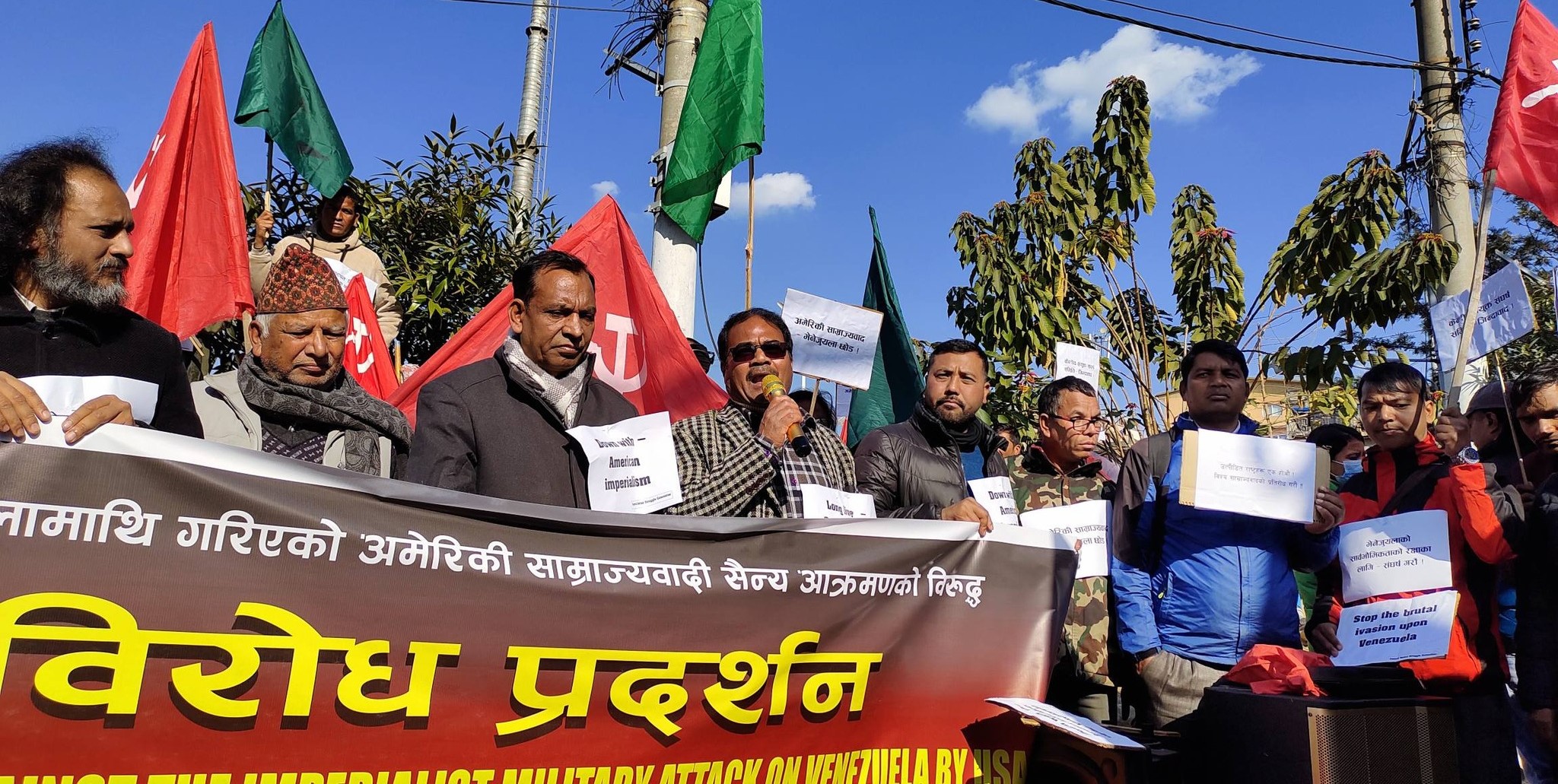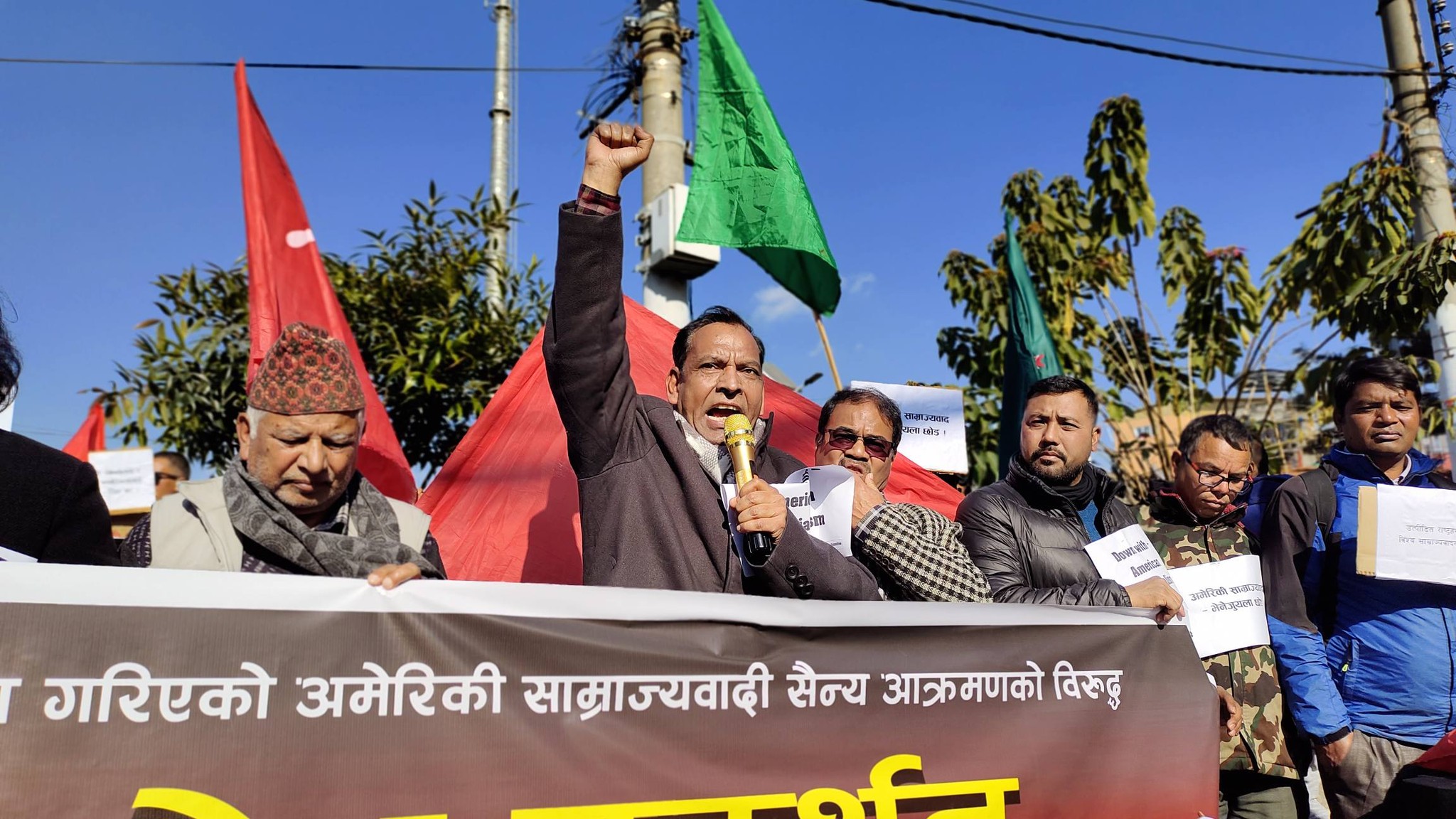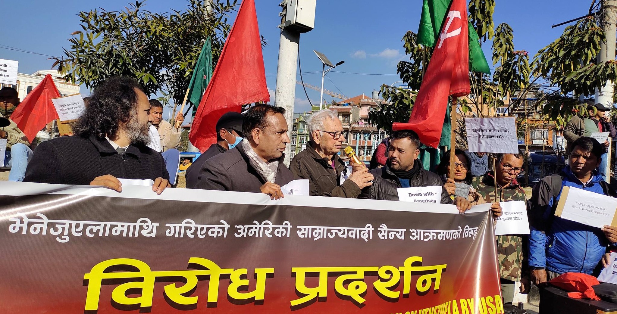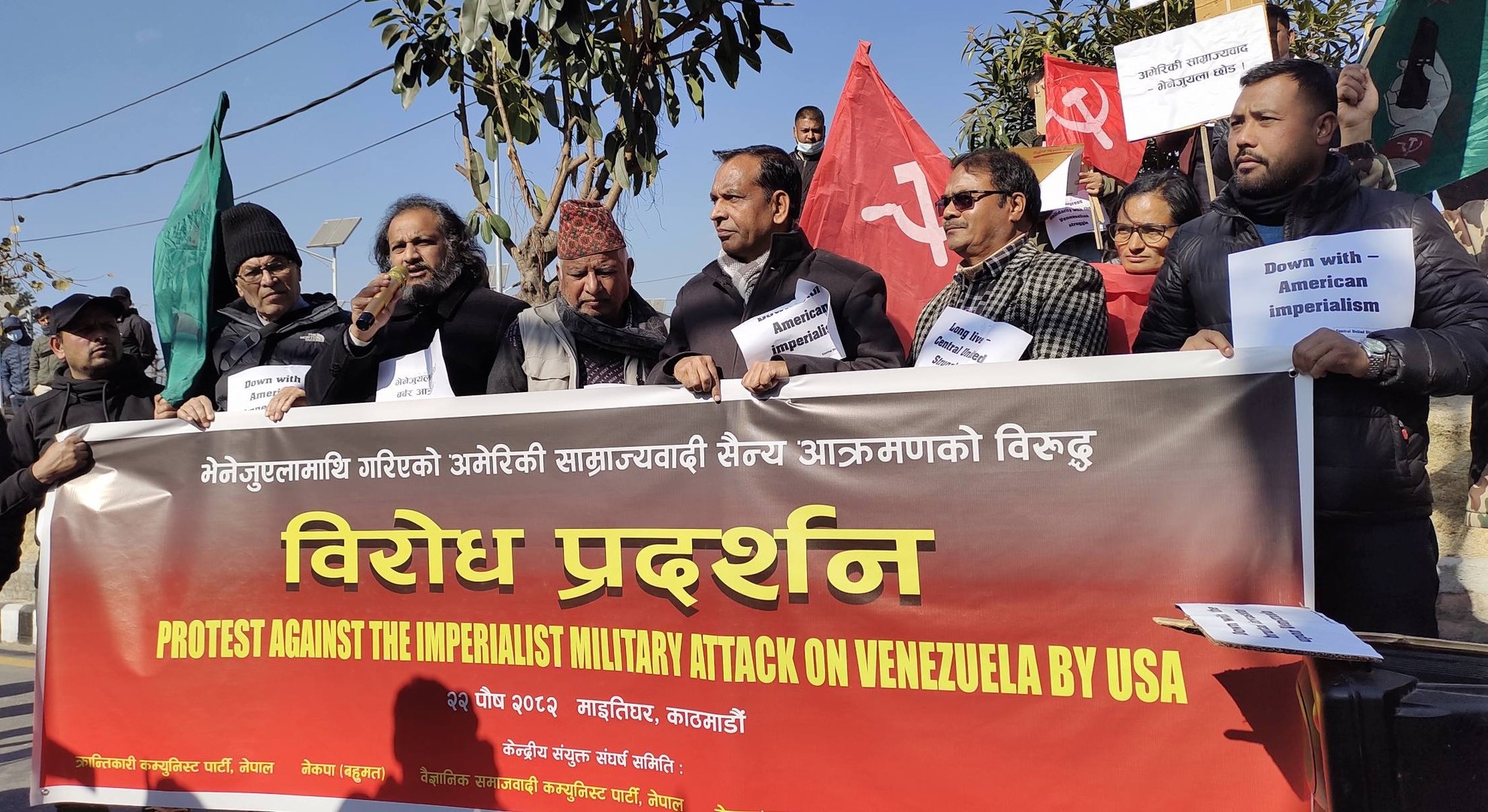 नेपालका ६ वटा क्रान्तिकारी कम्युनिस्ट पार्टीसम्बद्ध केन्द्रीय संयुक्त संघर्ष समितिले आयोजना गरेको उक्त प्रदर्शनमार्फत अमेरिकी साम्राज्यवादले भेनेजुएलाजस्ता सार्वभौम मुलुकमाथि गरेको हस्तक्षेप, सैन्य आक्रमण र दबाबको विरोध गर्दै विश्वका उत्पीडित राष्ट्रहरूसँग ऐक्यबद्धता जनाइएको आयोजकले जनाएको छ । संघर्ष समितिका अनुसार विश्व साम्राज्यवादविरुद्ध एकजुट भएर प्रतिरोध निर्माण गर्ने उद्देश्यले यस्ता आन्दोलनहरूलाई निरन्तरता दिइने नेकपा (बहुमत) का नेता दीपक चलाउनेले जानकारी दिए ।