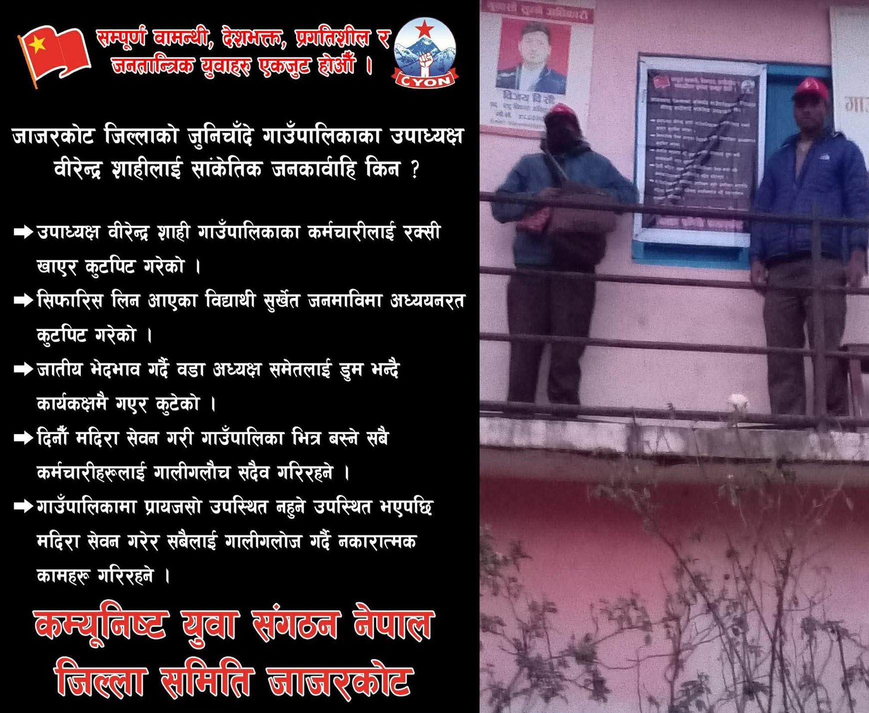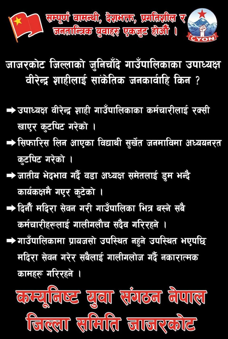 जाजरकोट । जाजरकोट जिल्लाको जुनिचाँदे गाउँपालिकाका उपाध्यक्ष वीरेन्द्र शाही विरुद्ध विभिन्न गम्भीर आरोप लगाउँदै कन्क्युनिस्ट युवा संगठन नेपाल, जिल्ला समिति जाजरकोटले ब्यानर टाँसेर सांकेतिक कारबाही गरेको जनाएको छ । संगठनद्वारा सार्वजनिक गरिएको ब्यानरमा उपाध्यक्ष शाहीले गाउँपालिकाका कर्मचारीहरूमाथि शारीरिक तथा मानसिक दुर्व्यवहार गर्ने, रिसानीका आधारमा कर्मचारीलाई कुटपिट गर्ने जस्ता कार्य गर्दै आएको आरोप लगाइएको छ । साथै, सिफारिस लिएर आएका तथा स्थानीय विद्यालयमा अध्ययनरत विद्यार्थीहरूलाई समेत दुर्व्यवहार गरिएको दाबी गरिएको छ । विज्ञप्तिमा उपाध्यक्ष शाहीले जातीय विभेद गर्दै वडा अध्यक्षलगायत जनप्रतिनिधिलाई अपमानजनक शब्द प्रयोग गर्ने, कार्यकक्षमै दुर्व्यवहार गर्ने र बैठक तथा कार्यालय समयमै मदिरा सेवन गरी कर्मचारीहरूमाथि गालीगलौज गर्ने गरेको आरोप उल्लेख छ ।