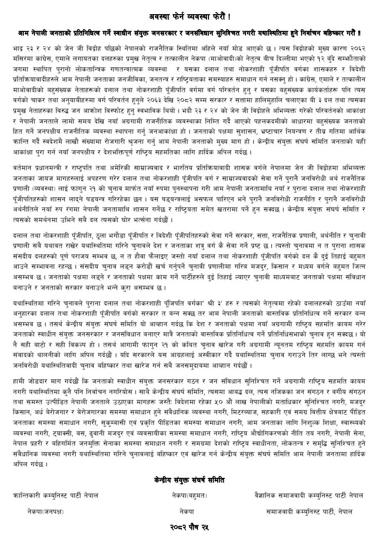 काठमाडौँ — केन्द्रीय संयुक्त संघर्ष समितिले यथास्थितिमा गरिने आगामी फागुन २१ को निर्वाचन बहिष्कार गर्ने घोषणा गरेको छ । जनताको वास्तविक प्रतिनिधित्व गर्ने स्वाधीन संयुक्त जनसरकार र जनसंविधान सुनिश्चित नगरी गरिने कुनै पनि निर्वाचन देश र जनताको हितमा नहुने समितिको ठहर छ । समितिले भदौ २३ र २४ मा भएको ‘जेन जी विद्रोह’ पछि नेपालको राजनीतिक परिस्थितिमा नयाँ मोड आएको दाबी गर्दै त्यस विद्रोहको मूल कारण २०६२ मंसिरमा दिल्लीमा भएको १२ बुँदे सम्झौतापछि स्थापित वर्तमान राजनीतिक व्यवस्थाले जनजीविका, लोकतन्त्र र राष्ट्रियताका समस्या समाधान गर्न नसक्नु रहेको जनाएको छ । विज्ञप्तिमा कांग्रेस, एमाले र तत्कालीन नेकपा (माओवादी) का शीर्ष नेताहरू दलाल तथा नोकरशाही पुँजीपति वर्गमा रूपान्तरण भएको र त्यसको परिणाम स्वरूप २०६३ देखि हालसम्म सत्ता सञ्चालन गरेका दलहरूप्रति जनआक्रोश विस्फोट भएको उल्लेख गरिएको छ । जेन जी विद्रोहले नयाँ अग्रगामी राजनीतिक व्यवस्थाप्रतिको जनआकांक्षा अभिव्यक्त गरेको समितिको निष्कर्ष छ ।