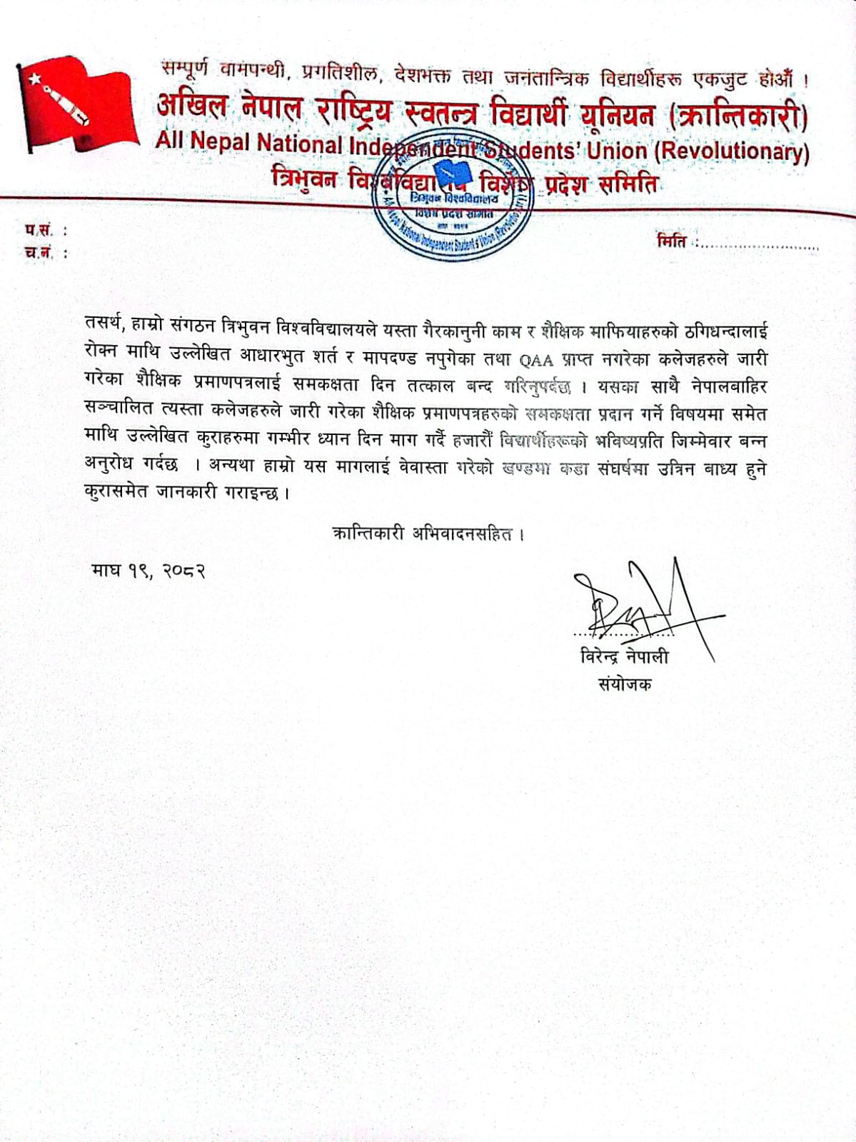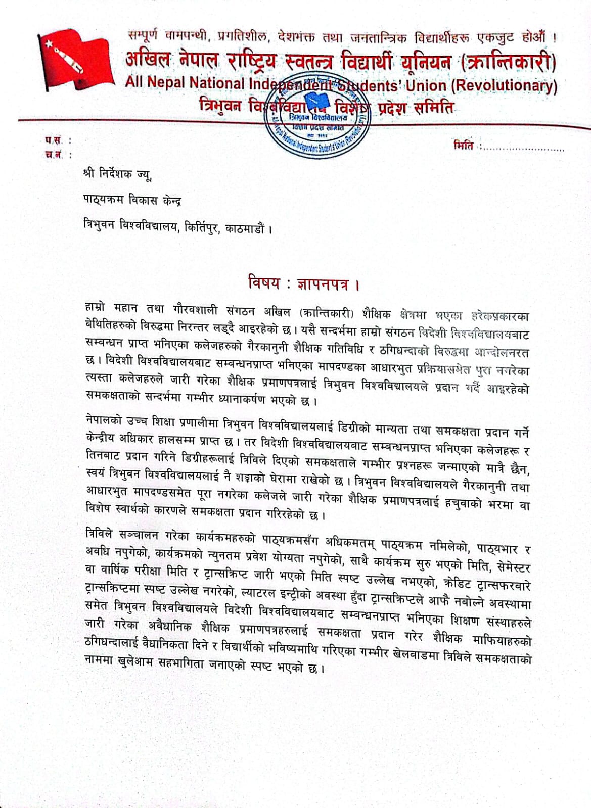 काठमाडौं, माघ १९ — अखिल (क्रान्तिकारी) ले विदेशी विश्वविद्यालयबाट सम्बन्धन प्राप्त भनिएका कलेजहरूले जारी गरेका अवैधानिक शैक्षिक प्रमाणपत्रलाई त्रिभुवन विश्वविद्यालय (त्रिवि) ले समकक्षता दिँदै आएको विषयप्रति गम्भीर आपत्ति जनाउँदै पाठ्यक्रम विकास केन्द्र, त्रिभुवन विश्वविद्यालयमा ज्ञापनपत्र बुझाएको छ । सोमबार संगठनका प्रतिनिधिले पाठ्यक्रम विकास केन्द्रका निर्देशकलाई ज्ञापनपत्र बुझाउँदै आधारभूत शैक्षिक मापदण्डसमेत पूरा नगरेका कलेजहरूले जारी गरेका प्रमाणपत्रलाई समकक्षता दिनु शैक्षिक माफियाको ठगीलाई वैधानिकता दिनु सरह भएको आरोप लगाएका छन् । ज्ञापनपत्रमा विदेशी विश्वविद्यालयबाट सम्बन्धन प्राप्त भनिएका कलेजहरूले सञ्चालन गरेका कार्यक्रमहरू त्रिविका पाठ्यक्रमसँग अधिकतम रूपमा नमिल्ने, पाठ्यभार तथा अध्ययन अवधि नपुगेको, न्यूनतम प्रवेश योग्यता पूरा नभएको, साथै ट्रान्सक्रिप्टमा परीक्षा मिति, क्रेडिट ट्रान्सफर तथा ल्याटरल इन्ट्रीसम्बन्धी स्पष्ट विवरण नखुलाइएकै अवस्थामा समकक्षता प्रदान गरिएको उल्लेख गरिएको छ । अखिल (क्रान्तिकारी) का अनुसार नेपालमा डिग्रीको मान्यता र समकक्षता प्रदान गर्ने केन्द्रीय अधिकार त्रिभुवन विश्वविद्यालयसँग रहे पनि गैरकानुनी र अपारदर्शी ढंगले दिइँदै आएको समकक्षताले स्वयं विश्वविद्यालयलाई नै शंकाको घेरामा पारेको छ । संगठनले हचुवाको भरमा वा विशेष स्वार्थका कारण समकक्षता दिइएको आशंका समेत व्यक्त गरेको छ ।