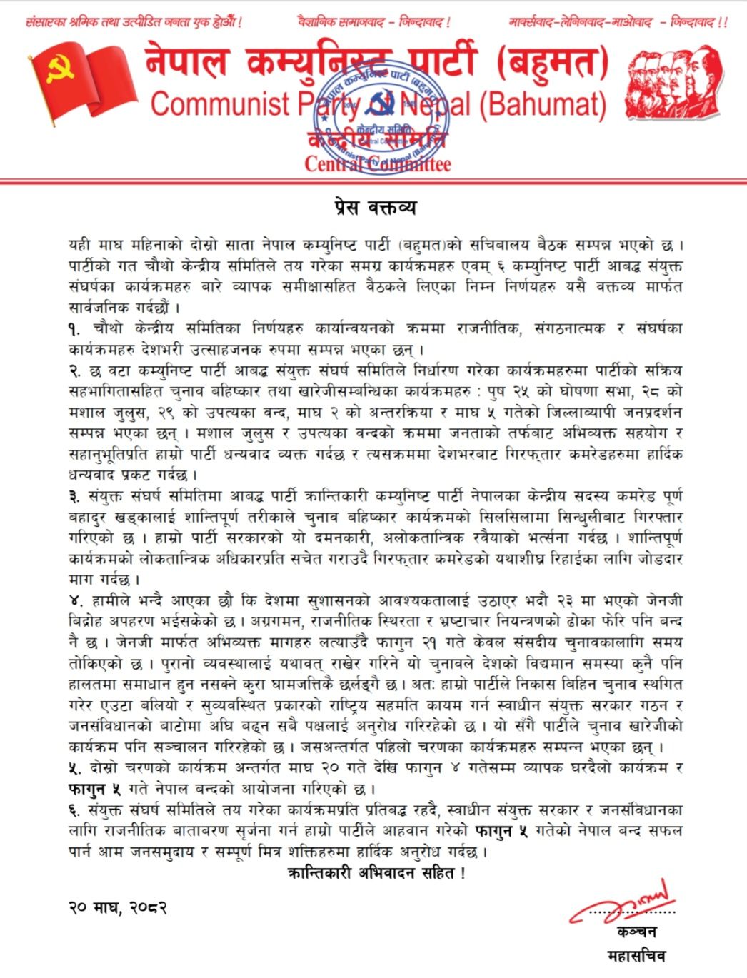 वक्तव्यमा जनजी विद्रोह अपहरण गरिएको आरोप लगाउँदै वर्तमान राजनीतिक अवस्था अगमन, राजनीतिक स्थिरता र भ्रष्टाचार नियन्त्रणमा असफल भएको उल्लेख गरिएको छ । पुरानो व्यवस्थालाई निरन्तरता दिने निर्वाचनले देशका विद्यमान समस्या समाधान गर्न नसक्ने पार्टीको ठहर छ । नेकपा (बहुमत) ले विकासविहीन चुनाव स्थगित गरी स्वाधीन संयुक्त सरकार गठन र जनसंविधान निर्माणका लागि राष्ट्रिय सहमतिको कार्यक्रम अघि बढाउनुपर्ने आवश्यकता औंल्याएको छ । पार्टीले चुनाव बहिष्कारको कार्यक्रमलाई निरन्तर अघि बढाउने निर्णयसमेत सार्वजनिक गरेको छ । पार्टीका अनुसार संघर्षको दोस्रो चरण अन्तर्गत माघ २० गतेदेखि फागुन ४ गतेसम्म व्यापक घरदैलो कार्यक्रम र फागुन ५ गते नेपाल बन्दको आयोजना गरिएको छ । नेपाल बन्द सफल पार्न आम जनसमुदाय तथा सम्पूर्ण मित्र शक्तिहरूलाई आह्वान गरिएको छ ।