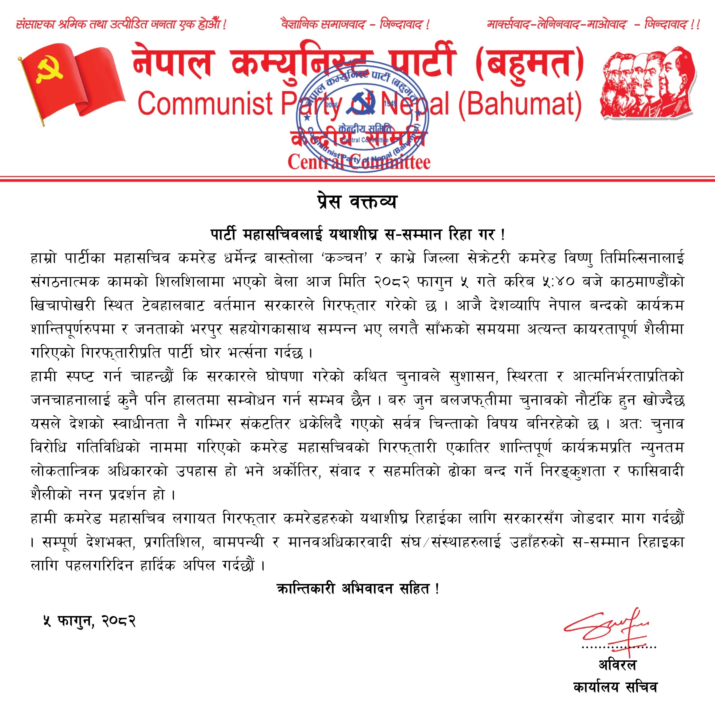 पार्टीले सरकारद्वारा घोषणा गरिएको निर्वाचनले सुशासन, स्थिरता र आत्मनिर्भरता सुनिश्चित गर्न नसक्ने दाबी गर्दै बलजफ्ती रूपमा चुनावी प्रक्रिया अघि बढाइए देशको स्वाधीनतामाथि गम्भीर असर पर्ने चेतावनी दिएको छ । महासचिवको गिरफ्तारीलाई शान्तिपूर्ण राजनीतिक गतिविधिमाथिको हस्तक्षेप र न्यूनतम लोकतान्त्रिक अधिकारको उल्लंघन भएको पनि वक्तव्यमा उल्लेख गरिएको छ । पार्टीले महासचिवसहित पक्राउ परेका सबै नेताहरूको यथाशीघ्र रिहाइको माग गर्दै देशभक्त, प्रगतिशील, वामपन्थी तथा मानवअधिकारवादी संघ–संस्थाहरूलाई रिहाइका पक्षमा पहल गर्न अपिल गरेको छ ।