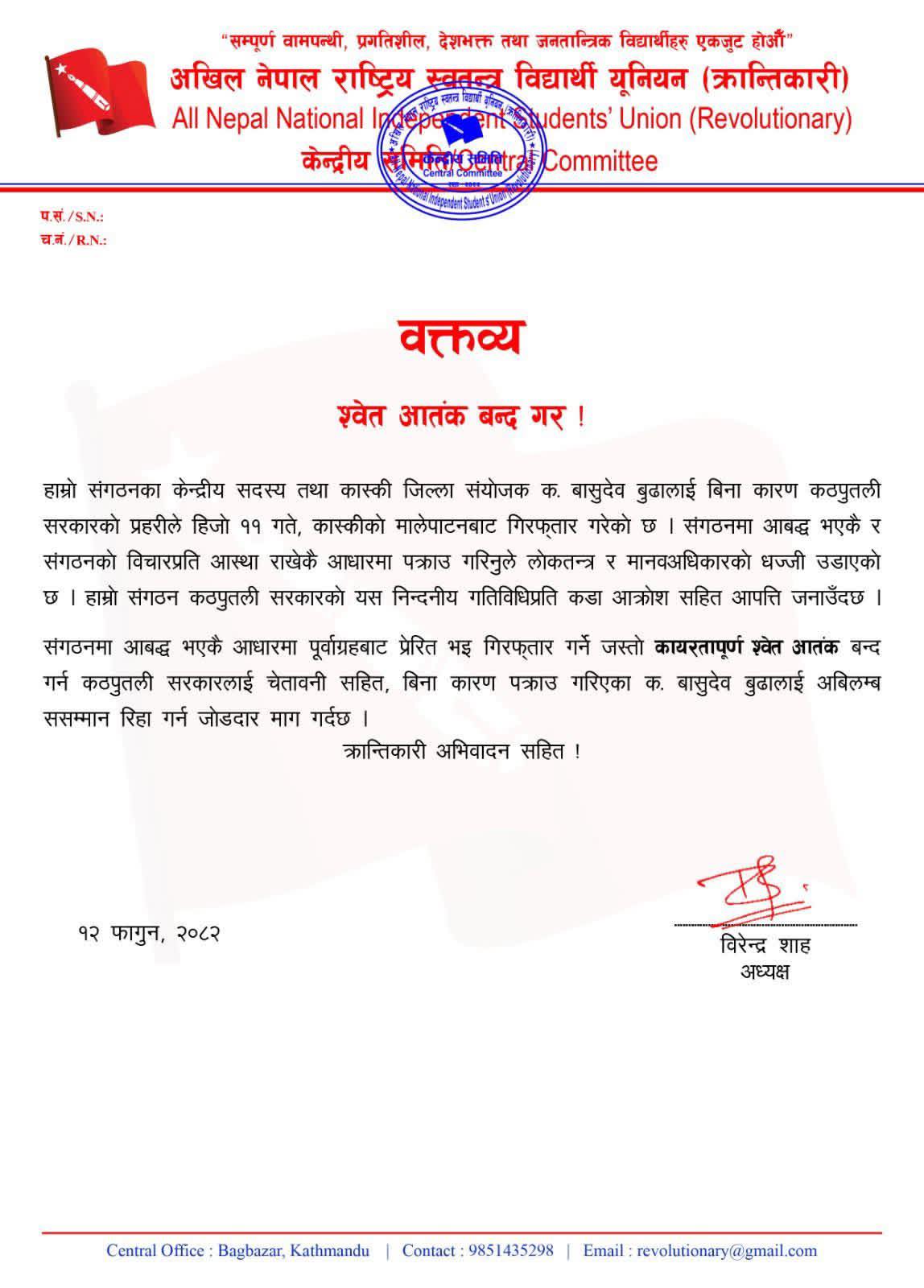 काठमाडौँ, फागुन १२ । अखिल(क्रान्तिकारी)का केन्द्रीय सदस्य तथा कास्की जिल्ला संयोजक बासुदेव बुढालाई पक्राउ गरिएको घटनाप्रति उक्त संगठनले कडा आपत्ति जनाएको छ । संगठनका केन्द्रीय अध्यक्ष विरेन्द्र शाहले मंगलबार एक विज्ञप्ति जारी गर्दै बुढालाई कास्कीको मालपोत क्षेत्रबाट २०८२ फागुन ११ गते संगठनात्मक काममा भएको बेला बिना कारण पक्राउ गरिएको जनाएका हुन । विज्ञप्तिमा भनिएको छ, संगठनमा आबद्ध भएकै आधारमा पूर्वाग्रह राखी गिरफ्तारी गरिएको आरोप लगाइएको छ ।