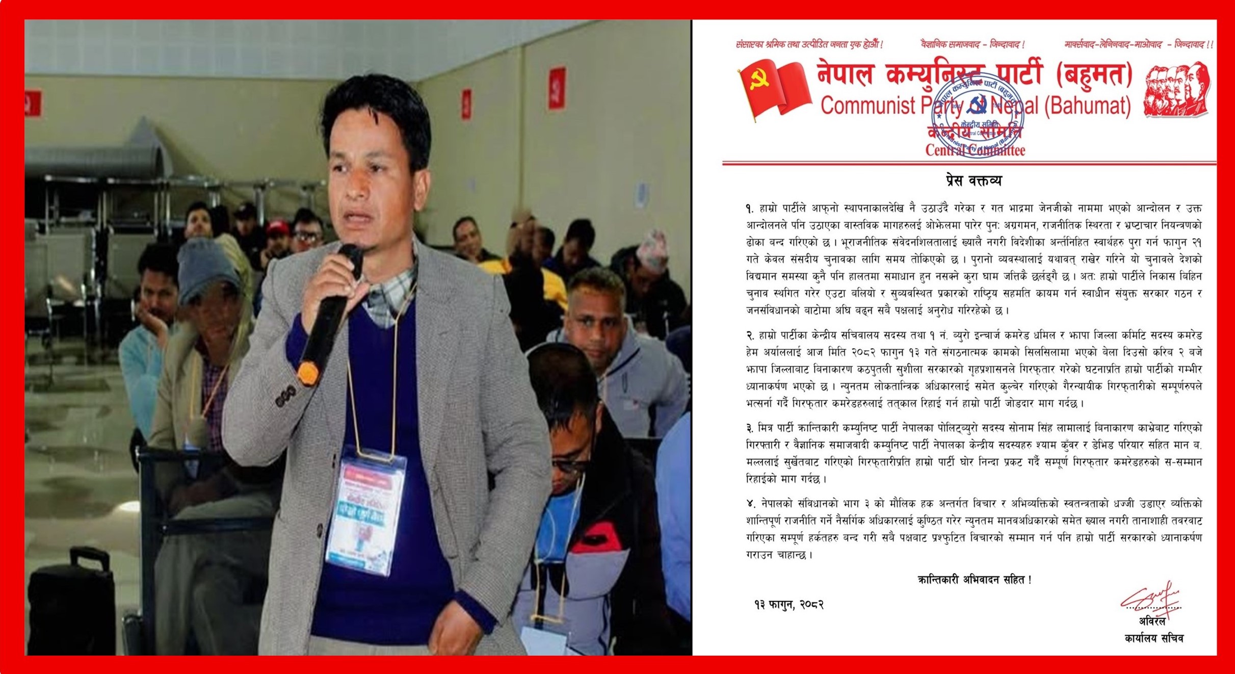 साथै वक्तव्यमा पार्टीले स्थापना कालदेखि उठाउँदै आएका एजेन्डा र जनताको नाममा सञ्चालन गरिएको आन्दोलनका मुद्दाहरूलाई बेवास्ता गरिएको आरोप लगाएको छ । पुरानै व्यवस्था कायम राख्दै गरिएको निर्वाचनले मुलुकका विद्यमान समस्या समाधान गर्न नसक्ने दाबी गर्दै पार्टीले निकासविहीन चुनाव स्थगित गरी राष्ट्रिय सहमतिको सरकार गठन गर्नुपर्ने धारणा सार्वजनिक गरेको छ । पार्टीले संविधानले सुनिश्चित गरेको विचार तथा अभिव्यक्तिको स्वतन्त्रताको सम्मान गर्न सरकारसँग आग्रह गरेको छ । शान्तिपूर्ण राजनीतिक गतिविधिमा संलग्न व्यक्तिहरूमाथि दमन नगर्न चेतावनी दिँदै लोकतान्त्रिक अधिकारको रक्षा गर्न जोड दिएको छ ।