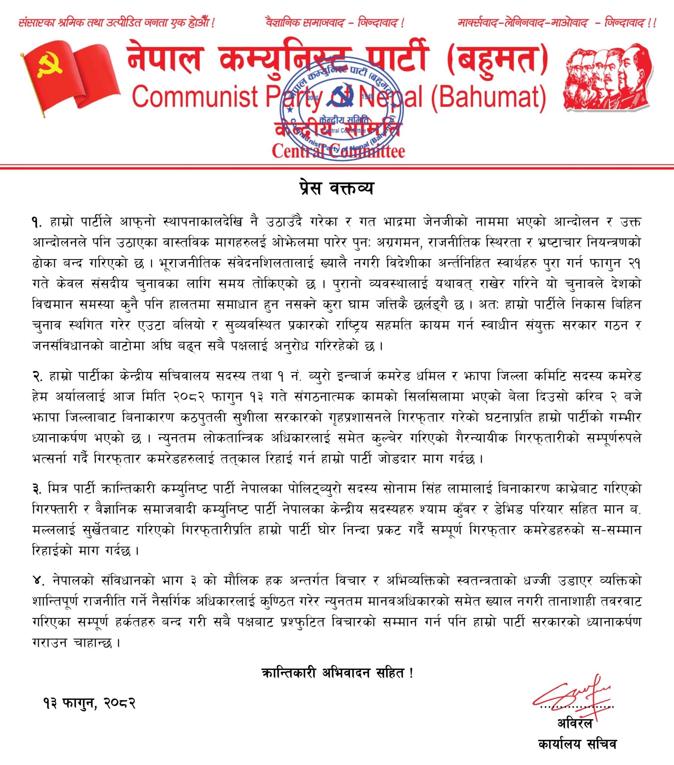 काठमाडौँ — नेपाल कम्युनिस्ट पार्टी (बहुमत) ले आफ्ना नेताको गिरफ्तारीप्रति गम्भीर आपत्ति जनाउँदै तत्काल रिहाइको माग गरेको छ । पार्टीको केन्द्रीय कार्यालय सचिव अविरलद्धारा जारी प्रेस वक्तव्यमा पार्टीका केन्द्रीय सचिवालय सदस्य तथा १ नम्बर ब्युरो इन्चार्ज धमिलसहित झापा जिल्ला कमिटी सदस्य हेम आचार्यलाई फागुन १३ गते करिब २ बजे झापाबाट पक्राउ गरिएको उल्लेख गर्दै पार्टीले यस घटनालाई राजनीतिक प्रतिशोधको संज्ञा दिएको छ । न्यूनतम लोकतान्त्रिक अधिकारको समेत उल्लंघन भएको भन्दै गिरफ्तार नेताहरूलाई बिना शर्त रिहा गर्न माग गरिएको छ । यसैगरी, अन्य मित्र कम्युनिस्ट पार्टीका नेताहरूको गिरफ्तारीप्रति आपत्ति जनाउदैसम्पूर्ण राजनीतिक बन्दीहरूको सम्मानपूर्वक रिहाइ हुनुपर्ने पार्टीको भनाइ छ ।