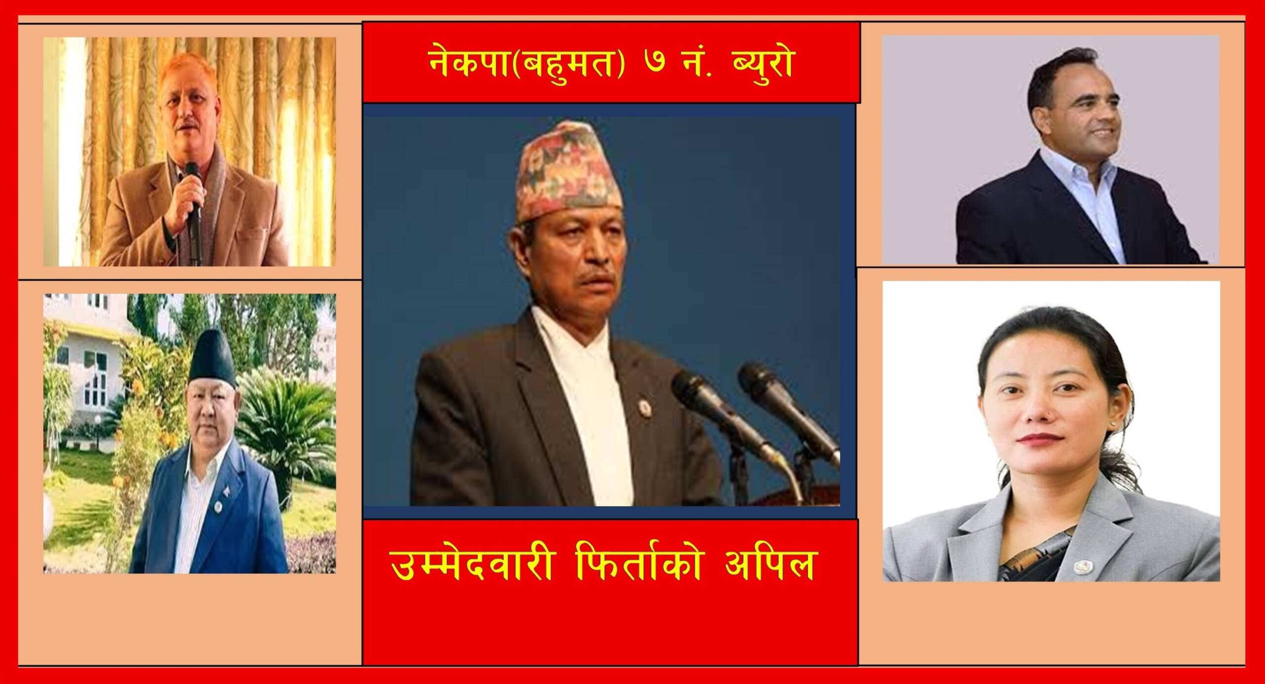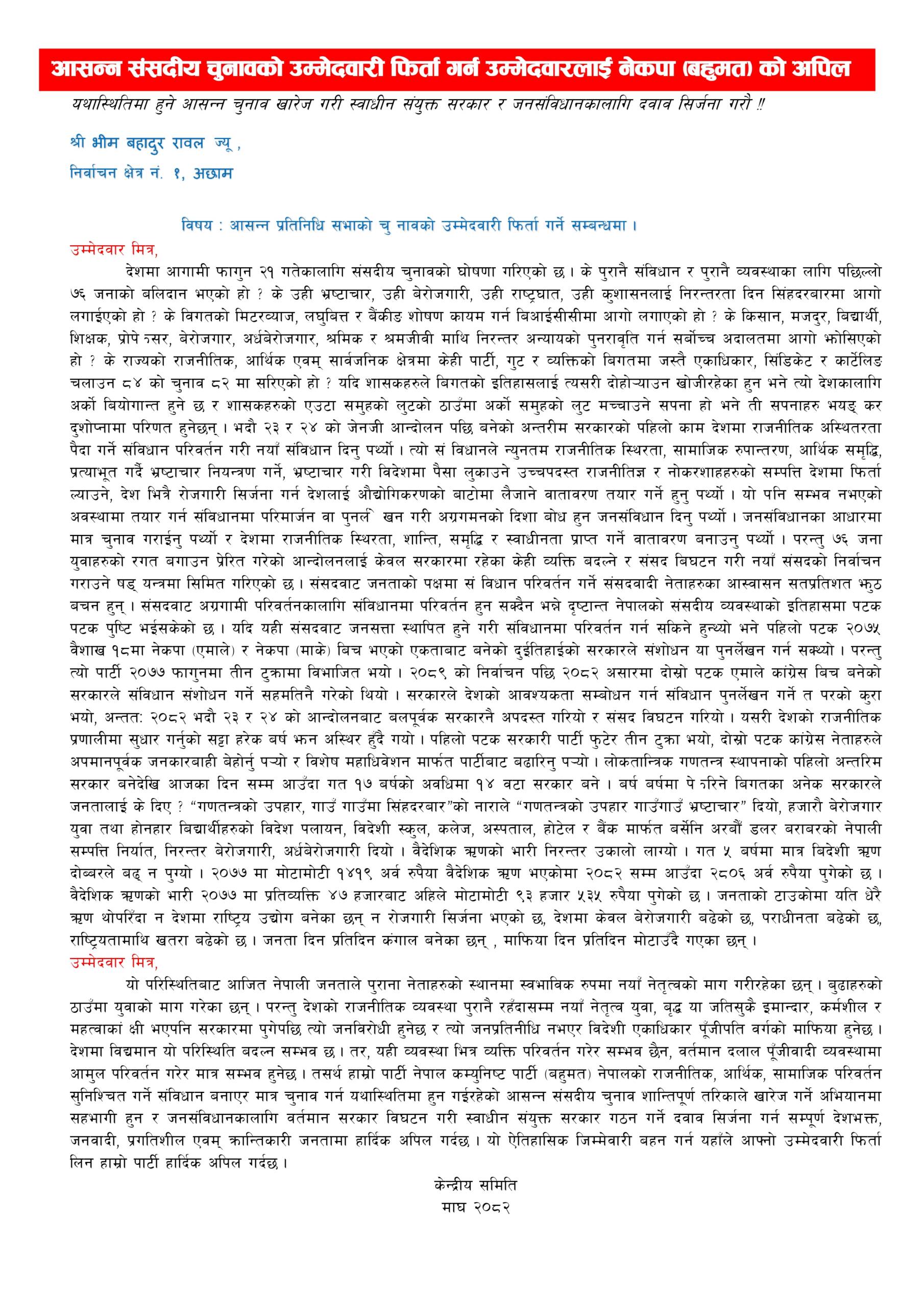 काठमाडौँ — नेपाल कम्युनिष्ट पार्टी (बहुमत) को ७ नम्बर ब्युरोले सरकारले घोषणा गरेको आगामी फागुन २१ गते हुने प्रतिनिधिसभा निर्वाचनका लागि सुदूरपश्चिम प्रदेशका १६ वटै निर्वाचन क्षेत्रमा प्रत्यक्षतर्फ उम्मेदवारी दिएका सबै उम्मेदवारलाई उम्मेदवारी फिर्ता लिन पत्राचार गरेको जनाएको छ । पार्टीका अनुसार कैलालीका ५, कञ्चनपुरका ३ सहित सुदूरपश्चिमका ९ जिल्लाका १६ वटै निर्वाचन क्षेत्रमा रहेका कुल १९२ जना उम्मेदवारलाई उम्मेदवारी फिर्ताका लागि औपचारिक अपिल गरिएको हो । पत्रमा भीम बहादुर रावल, लेखराज भट्ट, त्रिलोचन भट्ट, बिना मगर र प्रेम आले लगायतका सबै नेताहरूलाई पत्राचार गरिएको पार्टीको ७ नं. ब्युरोले जनाएको छ । पार्टीले पठाएको पत्रमा निम्न विषयहरु उल्लेख गरिएको छ ।
