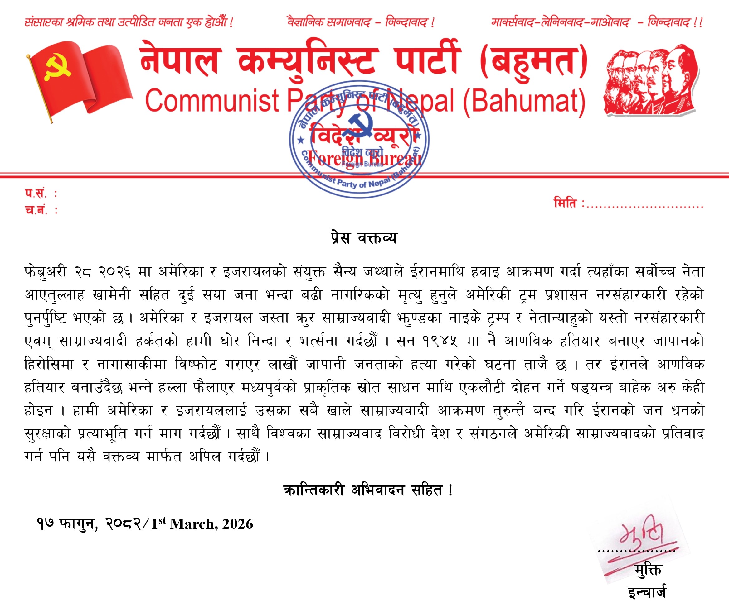 काठमाडौं । नेपाल कम्युनिस्ट पार्टी (बहुमत) विदेश ब्युरोले इरानमाथि भएकोे अमेरिका–इजरायल संयुक्त सैन्य आक्रमणको कडा शब्दमा निन्दा गरेको छ । पार्टीको विदेश ब्युरो इन्चार्ज मुक्तिद्धाराद्वारा जारी प्रेस वक्तव्यमा उक्त आक्रमणलाई “साम्राज्यवादी हस्तक्षेप” को संज्ञा दिँदै विरोध जनाइएको हो । विज्ञप्ति अनुसार २८ फेब्रुअरी २०२६ मा अमेरिका र इजरायलले संयुक्त रूपमा इरान माथि हवाई आक्रमण गर्दा त्यहाँका सर्वोच्च नेता आयातोल्लाह अली खामेनी सहित सर्वसाधारण नागरिकको ज्यान गएको घटनालाई “नरसंहारकारी कदम” भन्दै घोर भत्र्सना गरिएको छ ।