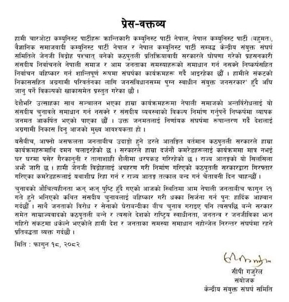 काठमाडौं, फागुन १८ — चार कम्युनिष्ट पार्टीहरूद्धारा निर्मित केन्द्रीय संयुक्त संघर्ष समितिले सोमबार एक प्रेस वक्तव्य जारी गर्दै नेपाली समाजमा देखिएका समस्या समाधानका लागि चुनाव बहिष्कार गरी समाजवादी व्यवस्था निर्माणतर्फ अग्रसर हुन आह्वान गरेका छन् । संयुक्त वक्तव्यमा क्रान्तिकारी कम्युनिष्ट पार्टी नेपाल, नेपाल कम्युनिष्ट पार्टी (बहुमत), वैज्ञानिक समाजवादी कम्युनिष्ट पार्टी र नेपाल कम्युनिष्ट पार्टीले वर्तमान संसदीय व्यवस्थाबाट जनताका आधारभूत समस्या समाधान हुन नसकेको निष्कर्ष निकालेका छन् ।