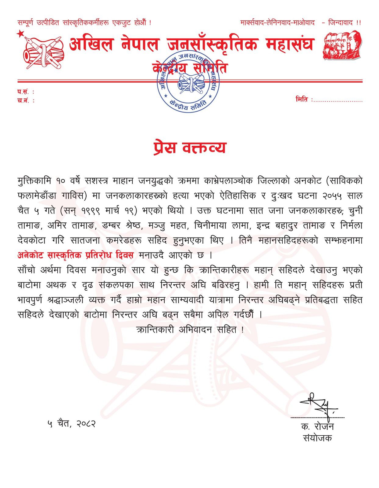 काठमाडौं, चैत्र ५ । अखिल नेपाल जनसाँस्कृतिक महासंघ (केन्द्रीय समिति) ले काभ्रेपलाञ्चोक जिल्लाको अनेकोट (साबिक फलामेढुङ्गा गाविस) मा २०५५ साल चैत ५ गते भएको जनकलाकारहरूको हत्याको दिन अर्थात ‘अनकोट सांस्कृतिक प्रतिरोध दिवस’ लाई स्मरण गरेको छ । महासंघ संयोजक रोजनद्वारा जारी प्रेस वक्तव्य अनुसार उक्त घटनामा सात जना जनकलाकार : चुनी तामाङ, अमिर तामाङ, डम्बर श्रेष्ठ, मञ्जु महत, चिनिमाया लामा, इन्द्र बहादुर तामाङ र निर्मला देवकोटा सहित सातजना जनकलाकारहरु सहिद भएका थिए । सो घटनालाई ऐतिहासिक तथा दुःखद् घटनाका रूपमा स्मरण गर्दै हरेक वर्ष उनीहरूको सम्मानमा यो दिवस मनाइँदै आएको महासंघले जनाएको छ ।