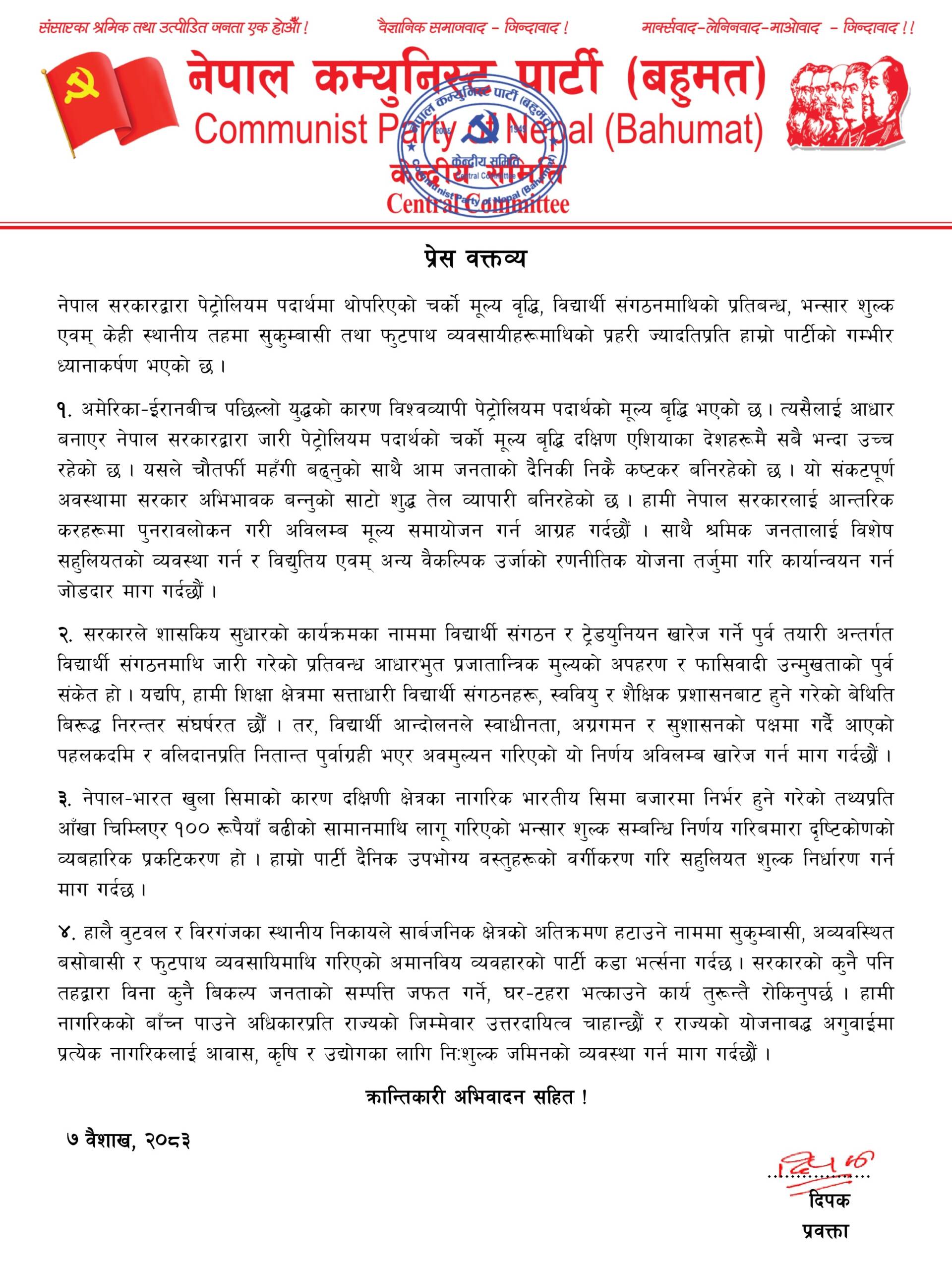 काठमाडौँ, वैशाख ७ । नेपाल कम्युनिस्ट पार्टी (बहुमत) ले पेट्रोलियम पदार्थको मूल्यवृद्धि, विद्यार्थी संगठनमाथिको प्रतिबन्ध, भन्सार शुल्क वृद्धि तथा स्थानीय तहमा भएको दमनकारी गतिविधिप्रति गम्भीर आपत्ति जनाएको छ । पार्टीको केन्द्रीय समितिद्वारा जारी प्रेस वक्तव्यमा अमेरिका–इरान द्वन्द्वका कारण अन्तर्राष्ट्रिय बजारमा पेट्रोलियम पदार्थको मूल्य बढेको सन्दर्भ उल्लेख गर्दै नेपाल सरकारले त्यसैलाई आधार बनाएर अस्वाभाविक रूपमा मूल्यवृद्धि गरेको आरोप लगाइएको छ । वक्तव्यमा भनिएको छ कि यसले आम नागरिकको दैनिक जीवनमा ठूलो असर पारेको छ र सरकार “संरक्षकभन्दा व्यापारीजस्तो देखिएको” टिप्पणी गरिएको छ । पार्टीले तत्काल मूल्य समायोजन गर्न तथा वैकल्पिक ऊर्जा स्रोतको दीर्घकालीन योजना ल्याउन माग गरेको छ । त्यसैगरी, विद्यार्थी संगठनमाथि लगाइएको प्रतिबन्धलाई पार्टीले लोकतान्त्रिक अधिकारमाथिको आक्रमण भन्दै आलोचना गरेको छ । शिक्षा क्षेत्रमा क्रियाशील स्वतन्त्र विद्यार्थी संगठनहरूलाई दमन गर्ने प्रयासलाई “फासिवादी प्रवृत्तिको संकेत” भन्दै यस्तो निर्णय तुरुन्त फिर्ता लिन सरकारसँग माग गरिएको छ ।