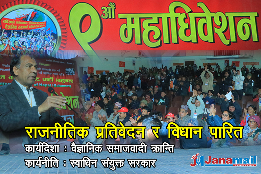 नवऔपनिवेशिक तथा दलाल पुँजीवादी व्यवस्थाको अन्त्य गरौँ !, समाजवादी गणतन्त्र स्थापनाको लागि नवौँ महाधिवेशन सफल पारौँ !! भन्ने मूल नाराका साथ काठमाडौँको जमलस्थित राष्ट्रिय नाचघरमा शुक्रबार भव्य रुपमा उद्घाटन गरिएको नेपाल कम्युनिस्ट पार्टी (बहुमत) को ९औँ महाधिवेशन भोलि १० गतेसम्म चल्ने जनाइएको छ ।