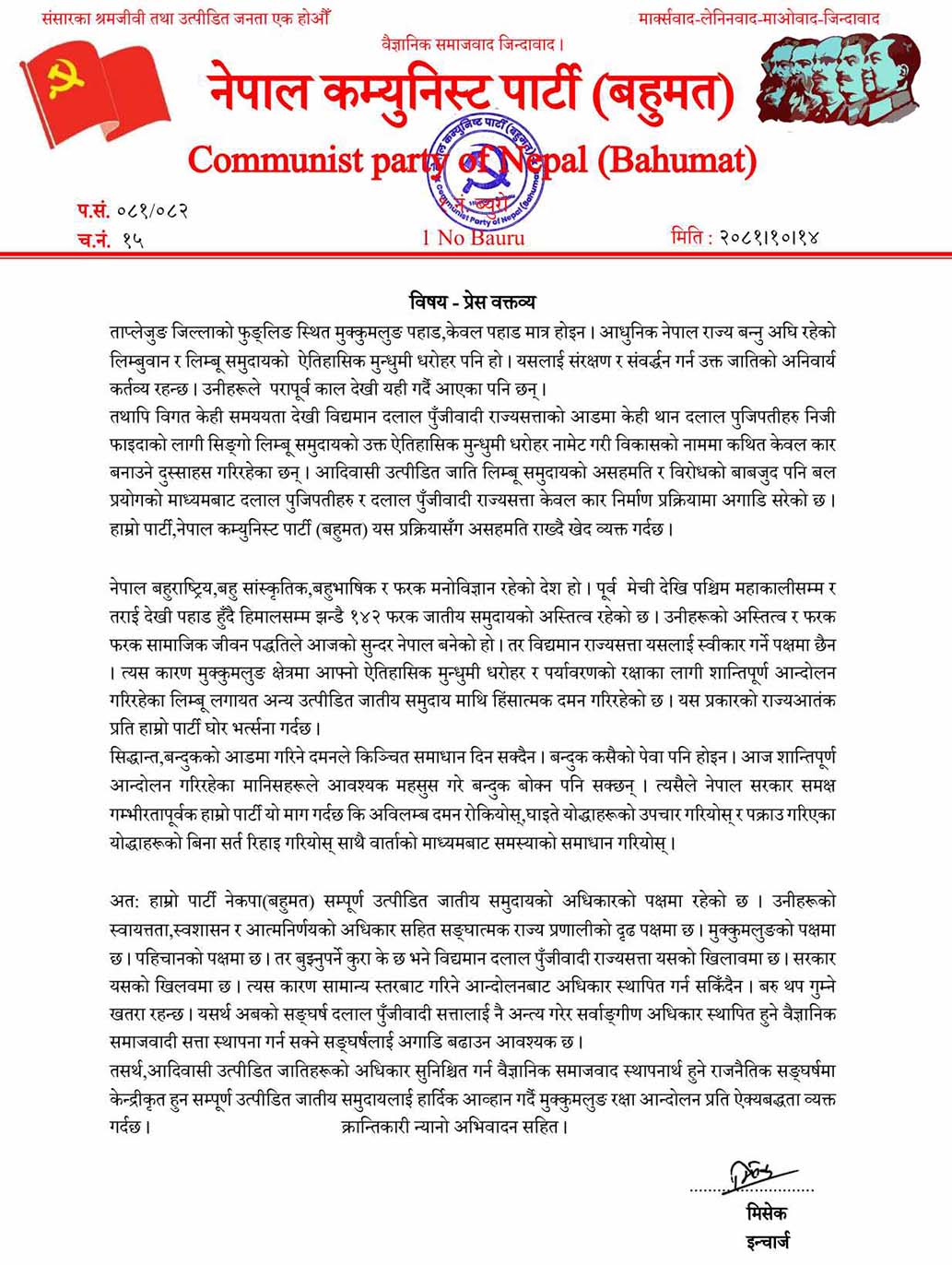 इन्चार्ज मिसेकले प्रेस वक्तव्यमा अगाडि भनेका छन्, ‘नेपाल बहुराष्ट्रिय, बहु सांस्कृतिक, बहुभाषिक र फरक मनोविज्ञान रहेको देश हो । पूर्व मेचीदेखि पश्चिम महाकालीसम्म र तराईदेखि पहाड हुँदै हिमालसम्म झन्डै १४२ फरक जातीय समुदायको अस्तित्व रहेको छ । उनीहरुको अस्तित्व र फरक फरक सामाजिक जीवन पद्धतिले आजको सुन्दर नेपाल बनेको हो । तर विद्यमान राज्यसत्ता यसलाई स्वीकार गर्ने पक्षमा छैन । त्यसकारण मुक्कुमलुङ क्षेत्रमा आफ्नो ऐतिहासिक मुन्धुमी धरोहर र पर्यावरणको रक्षाका लागि शान्तिपूर्ण आन्दोलन गरिरहेका लिम्बू लगायत अन्य उत्पीडित जातीय समुदायमाथि हिंसात्मक दमन गरिरहेको छ । यस प्रकारको राज्यआतंकप्रति हाम्रो पार्टी घोर भत्र्सना गर्दछ । सिद्धान्त, बन्दुकको आडमा गरिने दमनले किञ्चित समाधान दिन सक्दैन । बन्दुक कसैको पेवा पनि होइन । आज शान्तिपूर्ण आन्दोलन गरिरहेका मानिसहरुले आवश्यक महसुस गरे बन्दुक बोक्न पनि सक्छन् । त्यसैले नेपाल सरकार समक्ष गम्भीरतापूर्वक हाम्रो पार्टी यो माग गर्दछ कि अविलम्ब दमन रोकियोस्, घाइते योद्धाहरुको उपचार गरियोस् र पक्राउ गरिएका योद्धाहरुको बिनासर्त रिहाइ गरियोस् साथै वार्ताको माध्यमबाट समस्याको समाधान गरियोस् ।’