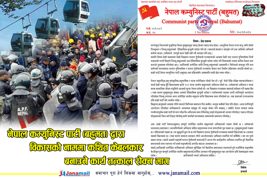 काठमाडौँ । नेपाल कम्युनिस्ट पार्टी (बहुमत) ले ताप्लेजुङमा विकासको नाममा कथित केबलकार बनाउने कार्य तत्काल रोक्न माग गरेको छ । सोमबार नेकपा (बहुमत) १ नं. व्युरो इन्चार्ज मिसेकले एक प्रेस वक्तव्यमार्फत आदिवासी उत्पीडित जाति लिम्बू समुदायको असहमति र विरोधको बाबजुद पनि बल प्रयोगको माध्यमबाट दलाल पुँजीपतिहरुले केवलकार निर्माण प्रक्रिया अगाडि सारेको भन्दै उक्त प्रक्रिया तत्काल रोक्न माग गरेका हुन् ।