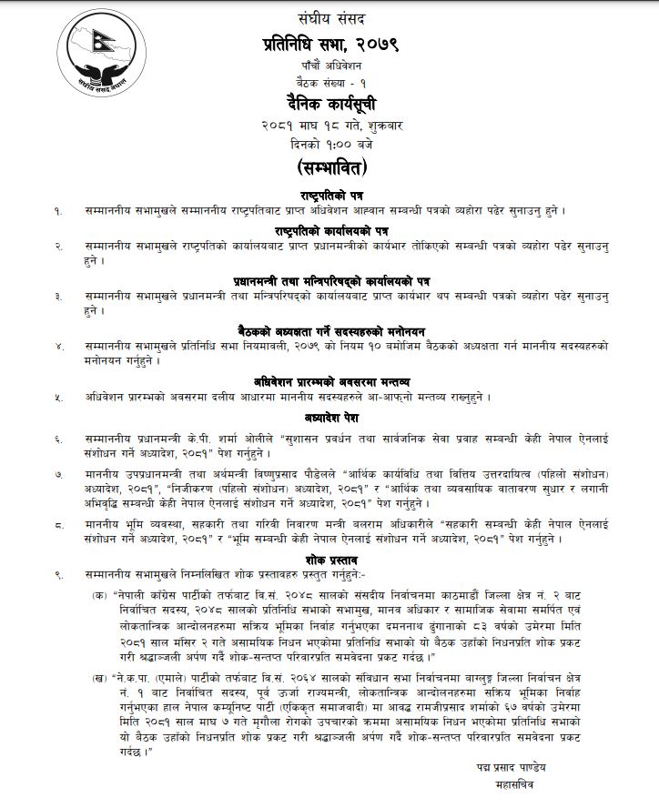 शुक्रबारको बैठकमा सभामुखले विभिन्न शोक प्रस्ताव प्रस्तुत गर्ने सम्भावित कार्यसूचि पनि छ । यसैगरी राष्ट्रियसभाको बैठकमा उल्लेखित कार्यसूचि बाहेक मिडिया काउन्सिल विधेयक, २०८० र नवीरकणीय ऊर्जा तथा ऊर्जा दक्षतासम्बन्धी विधेयक, २०८१ सम्बन्धी समितिको प्रतिवेदन पेश गर्ने कार्यसूचि छ ।