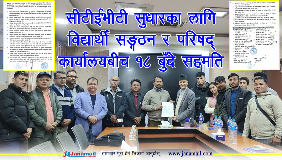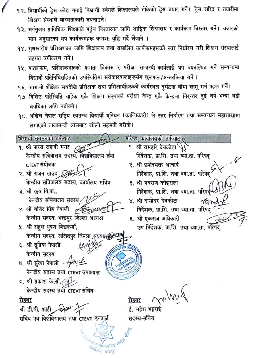 माघ १७ गते बिहीबार नेपाल कम्युनिस्ट पार्टी (बहुमत) निकट अखिल (क्रान्तिकारी) का सचिव एवम् विश्वविद्यालय तथा सीटीईभीटीका इन्चार्ज डीवी शाही र परिषद्का सदस्य सचिव रमेश भट्टराईको रोहबरमा विद्यार्थी सङ्गठनकाबाट श्री पारस राहादी मगरसहित आठजना र परिषद् कार्यालयबाट श्री रामहरि देवकोटासहित पाँचजनाको उपस्थितिमा परिषद् कार्यालयमा सीटीईभीटी सुधारका लागि पेश गरिएको मागका सम्बन्धमा छलफल गरी १८ बुँदामा सहमति भएको हो ।