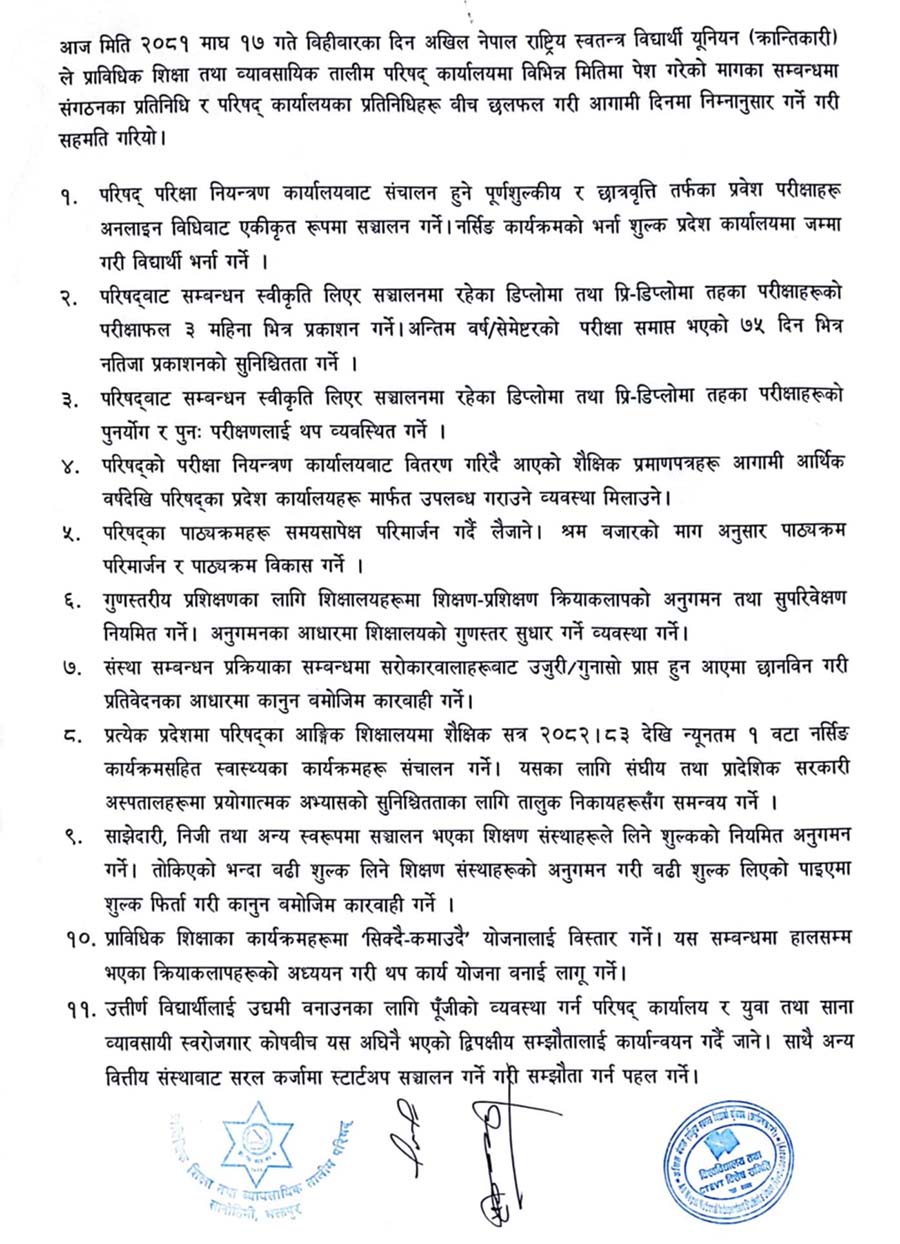 आज मिति २०८१ माघ १७ गते बिहीबारका दिन अखिल नेपाल राष्ट्रिय स्वतन्त्र विद्यार्थी यूनियन (क्रान्तिकारी) ले प्राविधिक शिक्षा तथा व्यावसायिक तालीम परिषद् कार्यालयमा विभिन्न मितिमा पेश गरेको मागका सम्बन्धमा सङ्गठनका प्रतिनिधि र परिषद् कार्यालयका प्रतिनिधिहरू बीच छलफल गरी आगामी दिनमा निम्नानुसार गर्नेगरी सहमति गरियो ।