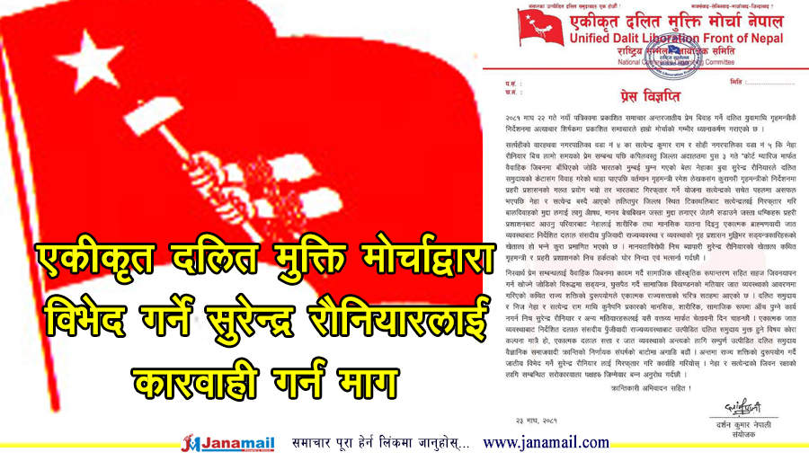 काठमाडौँ । एकीकृत दलित मुक्ति मोर्चा नेपालले माघ २२ गते नयाँ पत्रिकामा अन्तरजातीय प्रेम बिवाह गर्ने दलित युवामाथि गृहमन्त्रीकै निर्देशनमा अत्याचार भन्ने शिर्षकमा प्रकाशित समाचारले मोर्चाको गम्भीर ध्यानाकर्षण भएको भन्दै मानवता विरोधी निच व्यापारी सुरेन्द्र रौनियारको खेताला कथित गृहमन्त्री र प्रहरी प्रशासनको निच हर्कतको घोर निन्दा एवम् भत्र्सना गरेको छ ।