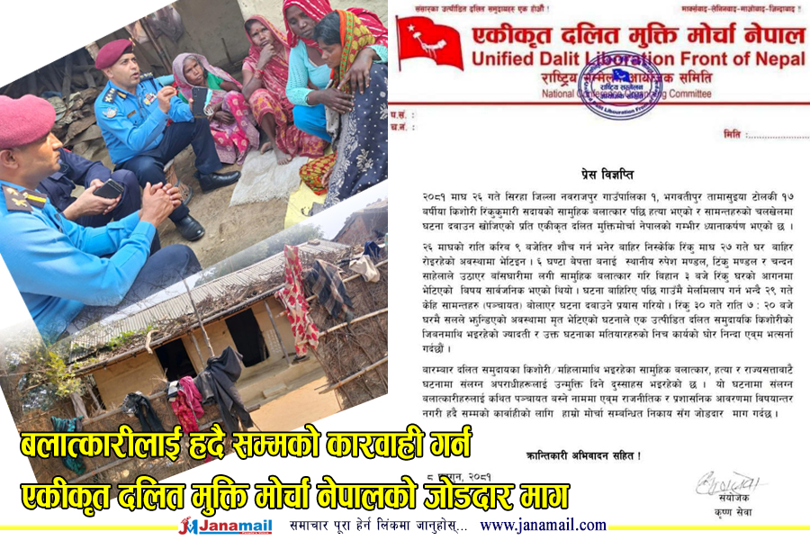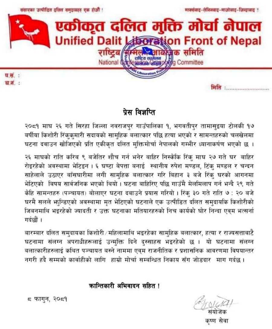 एकीकृत दलित मुक्ति मोर्चा नेपालका संयोजक कृष्ण सेवाले विज्ञप्तिमा भनेका छन्, ‘२०८१ माघ २६ गते सिरहा जिल्ला नवराजपुर गाउँपालिका १, भगवतीपुर तामासुइया टोलकी १७ बर्षीय किशोरी रिंकुकुमारी सदायको सामुहिक बलात्कारपछि हत्या भएको र सामन्तहरुको चलखेलमा घटना दवाउन खोजिएको प्रति एकीकृत दलित मुक्ति मोर्चा नेपालको गम्भीर ध्यानाकर्षण भएको छ ।’