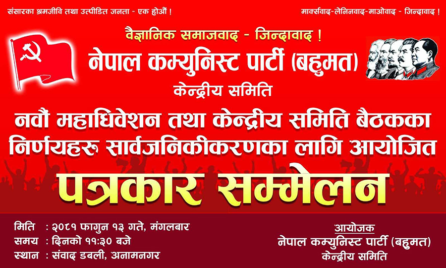 फागुन १३ गते (मङ्गलबार) बिहान ११ : ३० बजे काठमाडौँको अनामनगरस्थित संवाद डबलीमा पार्टीको नवौँ महाधिवेशन तथा केन्द्रीय समिति बैठकका निर्णयहरु सार्वजनिकीकरणका लागि पत्रकार सम्मेलन गर्ने आयोजक नेकपा (बहुमत) केन्द्रीय समितिले जनाएको छ ।