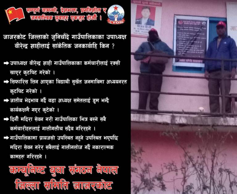 जाजरकोट । जाजरकोट जिल्लाको जुनिचाँदे गाउँपालिकाका उपाध्यक्ष वीरेन्द्र शाही विरुद्ध विभिन्न गम्भीर आरोप लगाउँदै कन्क्युनिस्ट...