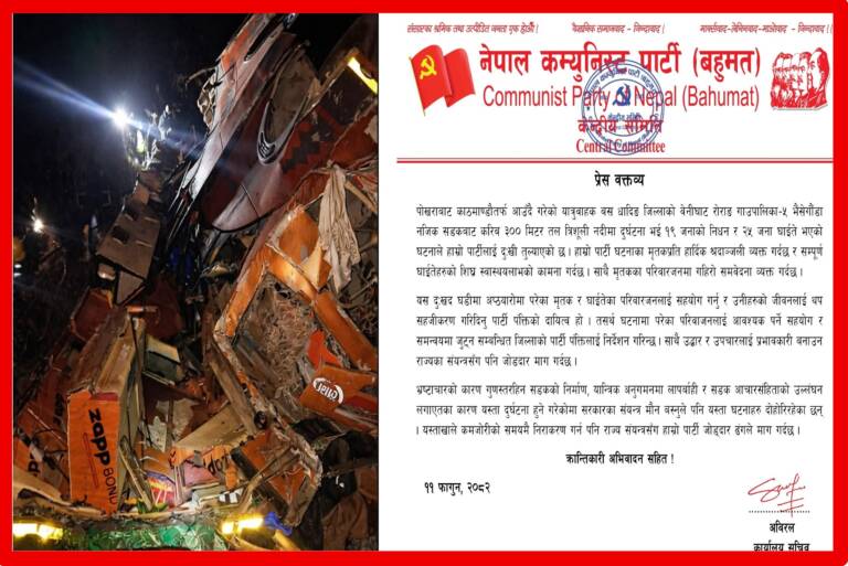 धादिङ बस दुर्घटनाप्रति नेकपा (बहुमत) को दुःख व्यक्त, प्रभावकारी उद्धार र उपचारको माग