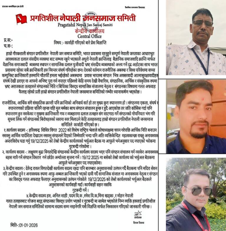 प्रगतिशील नेपाली जनसमाज समितिद्वारा संगठन विरोधी गतिविधिमा संलग्नमाथि कारबाही